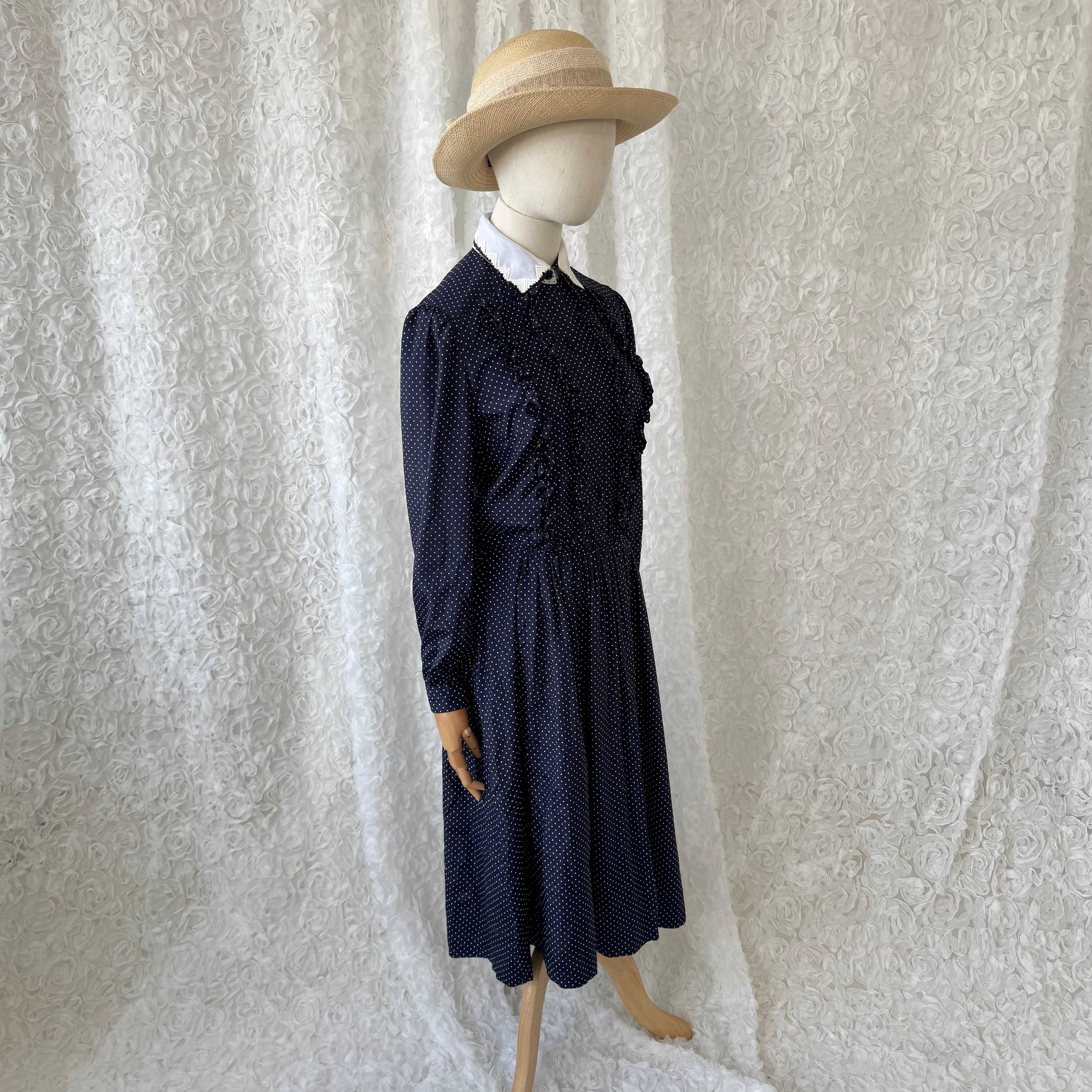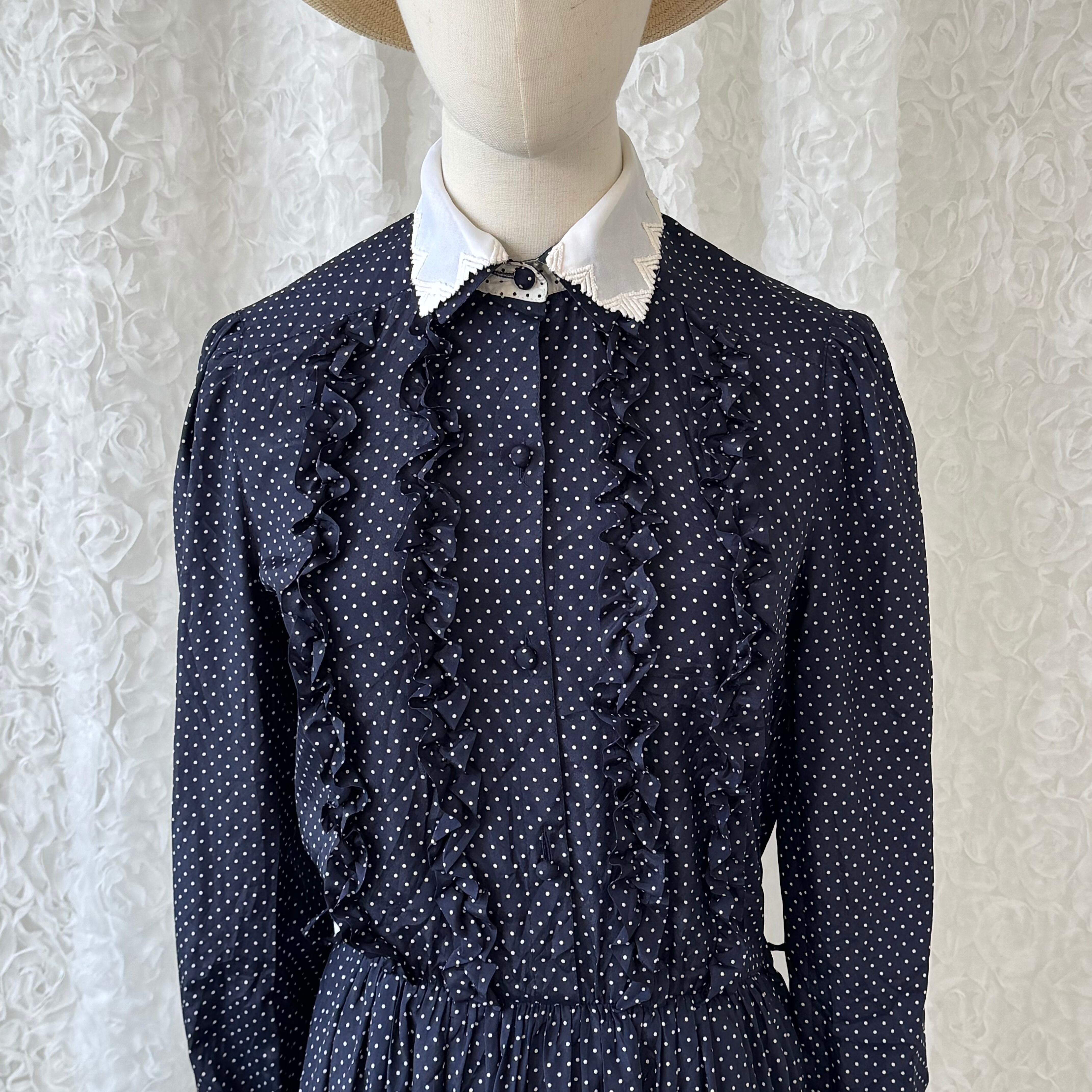 ヴィンテージ ドットワンピース フリルデザイン ネイビー 長袖 レトロワンピース ヨーロッパ古着 クラシカルワンピース