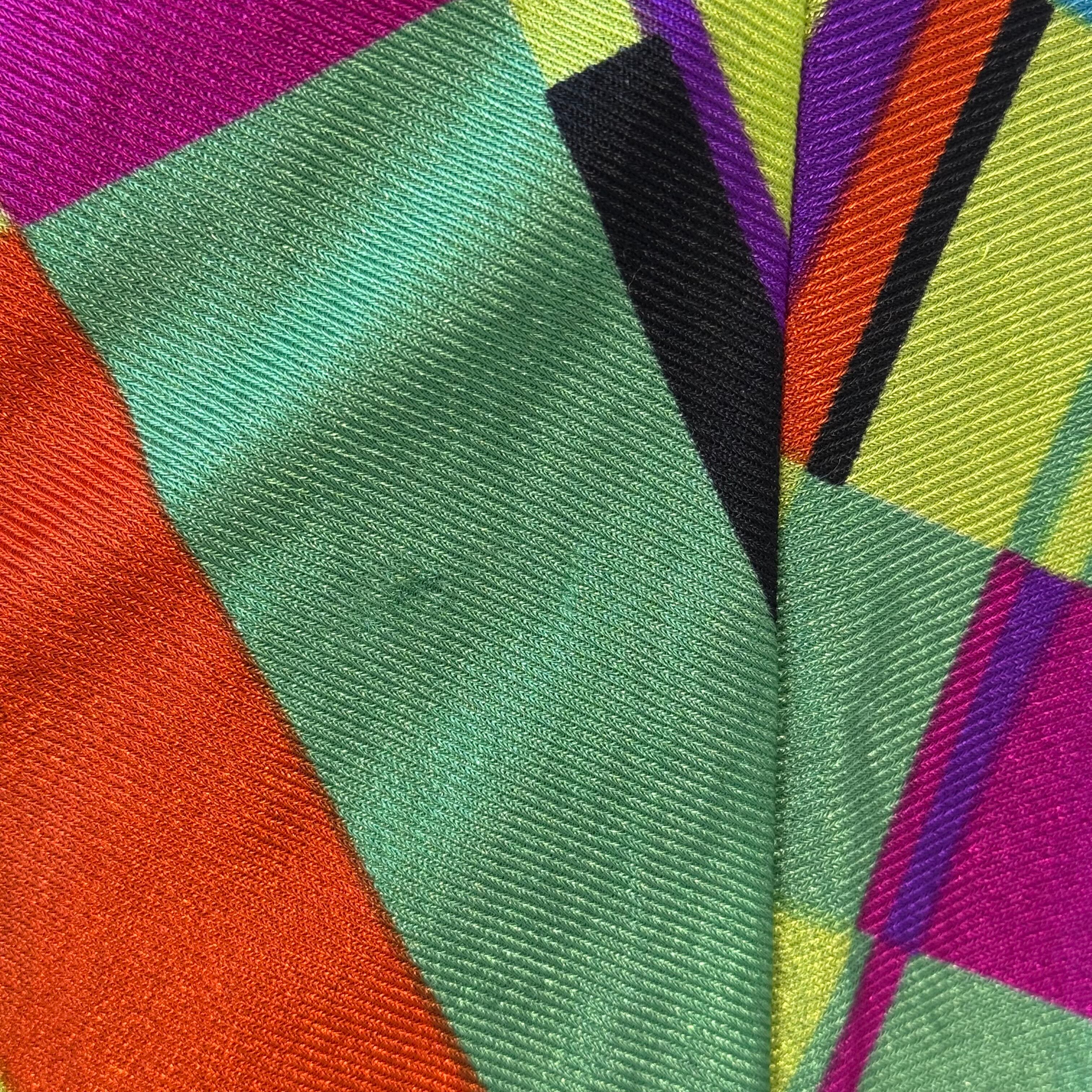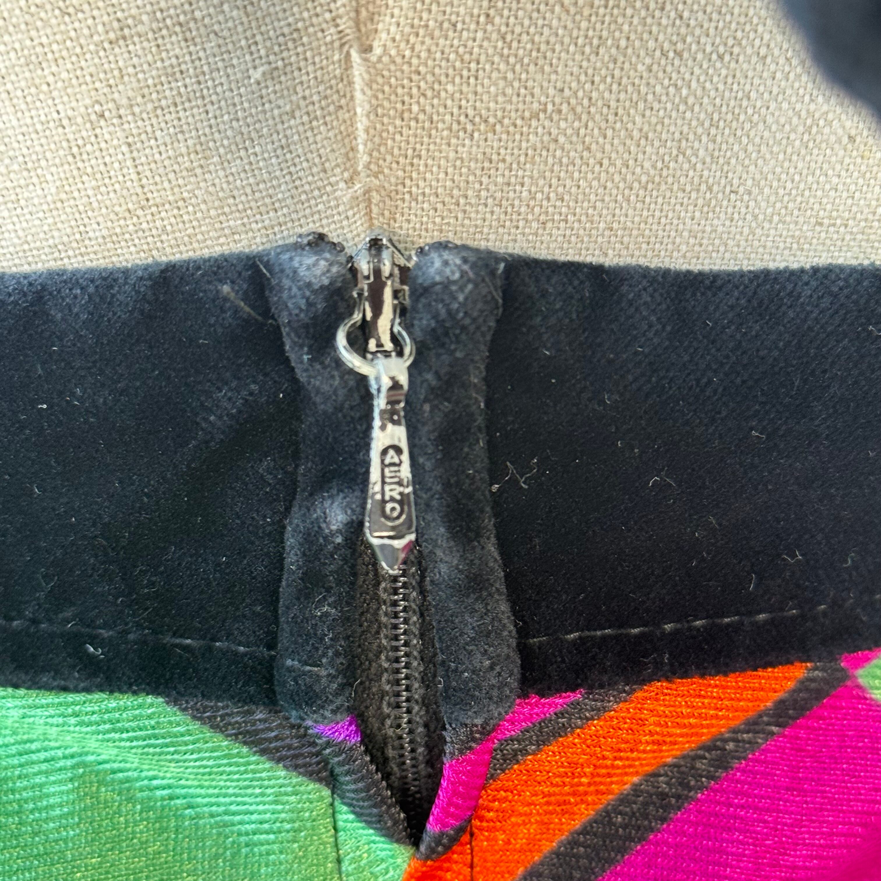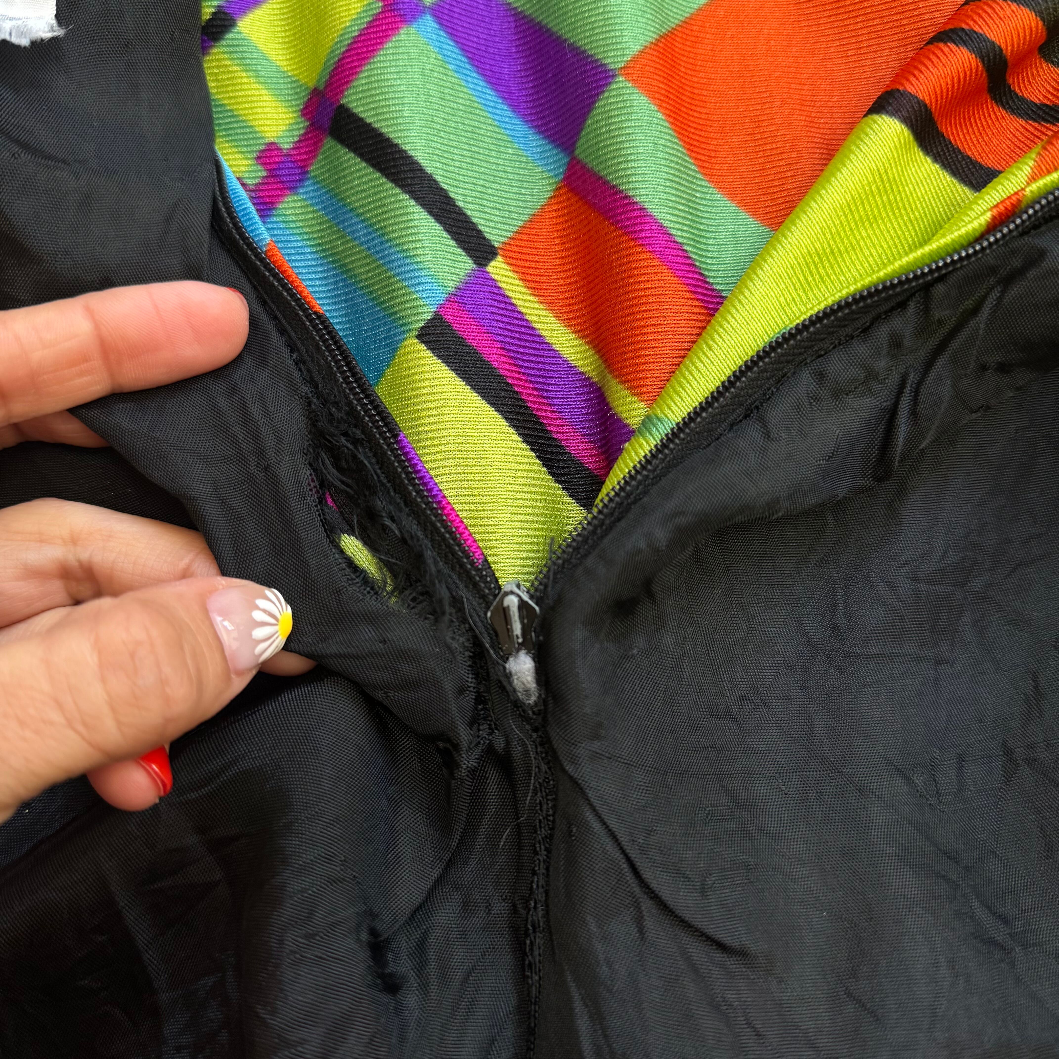 目を惹くカラフルチェックのロングスカートを組み合わせた華やかなヴィンテージドレス。