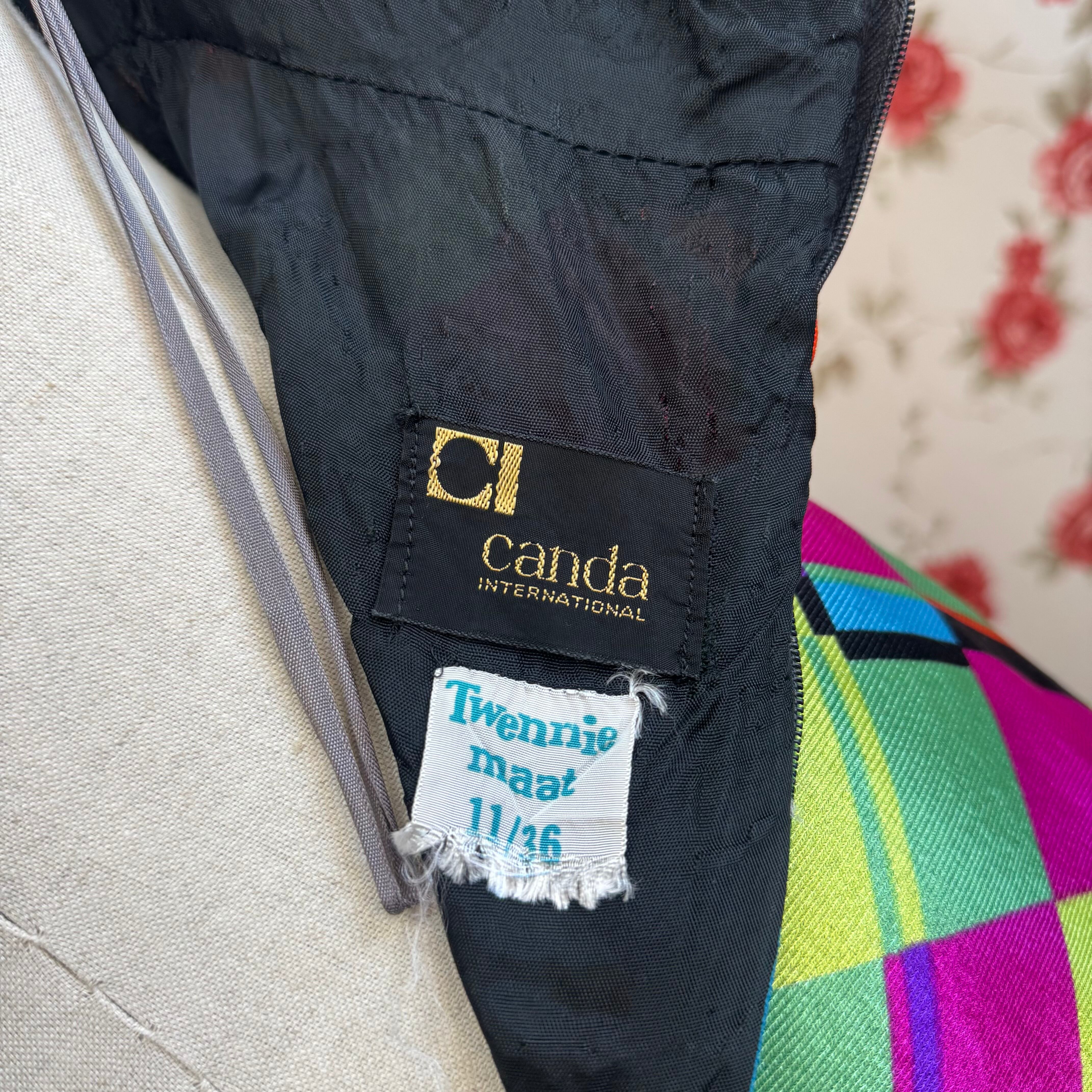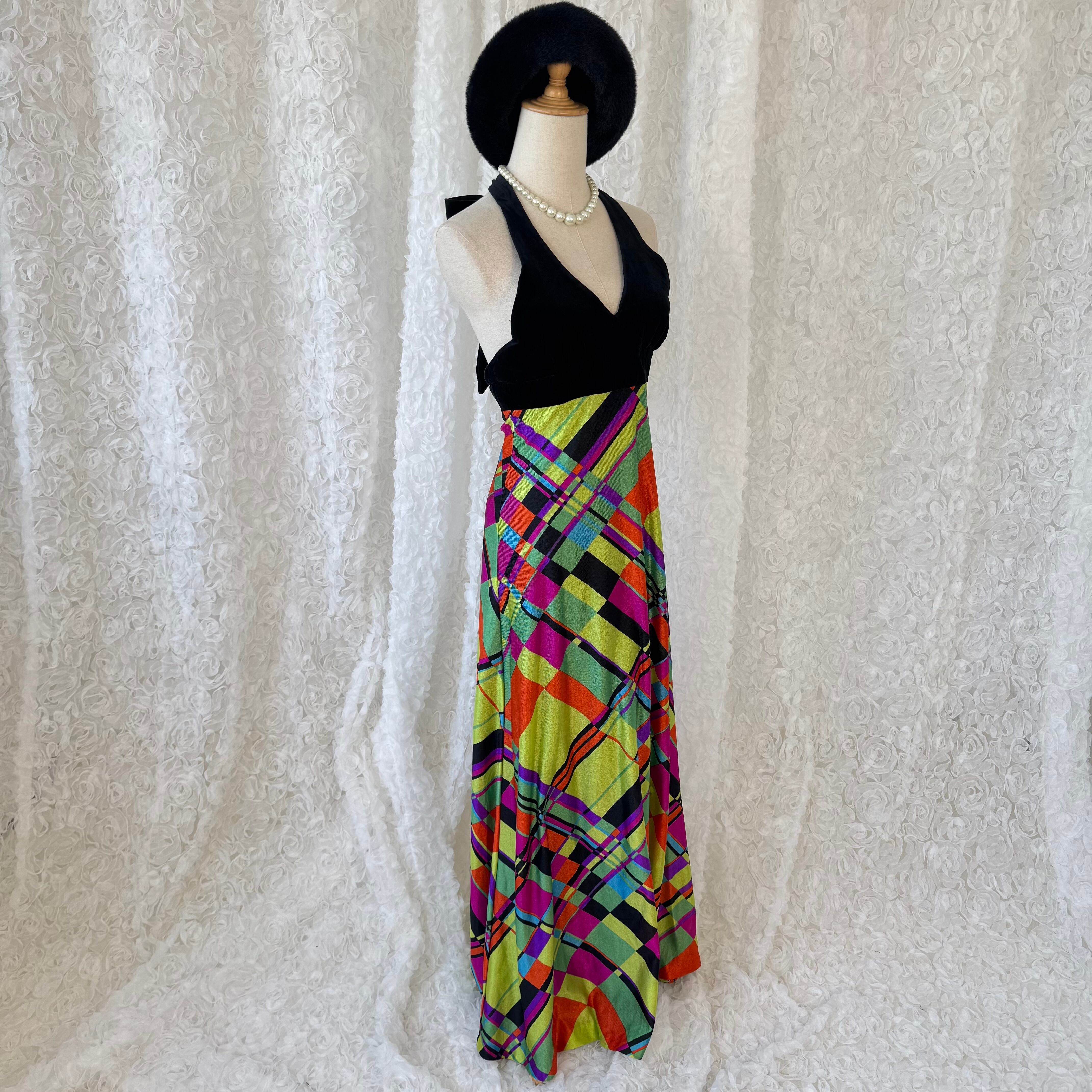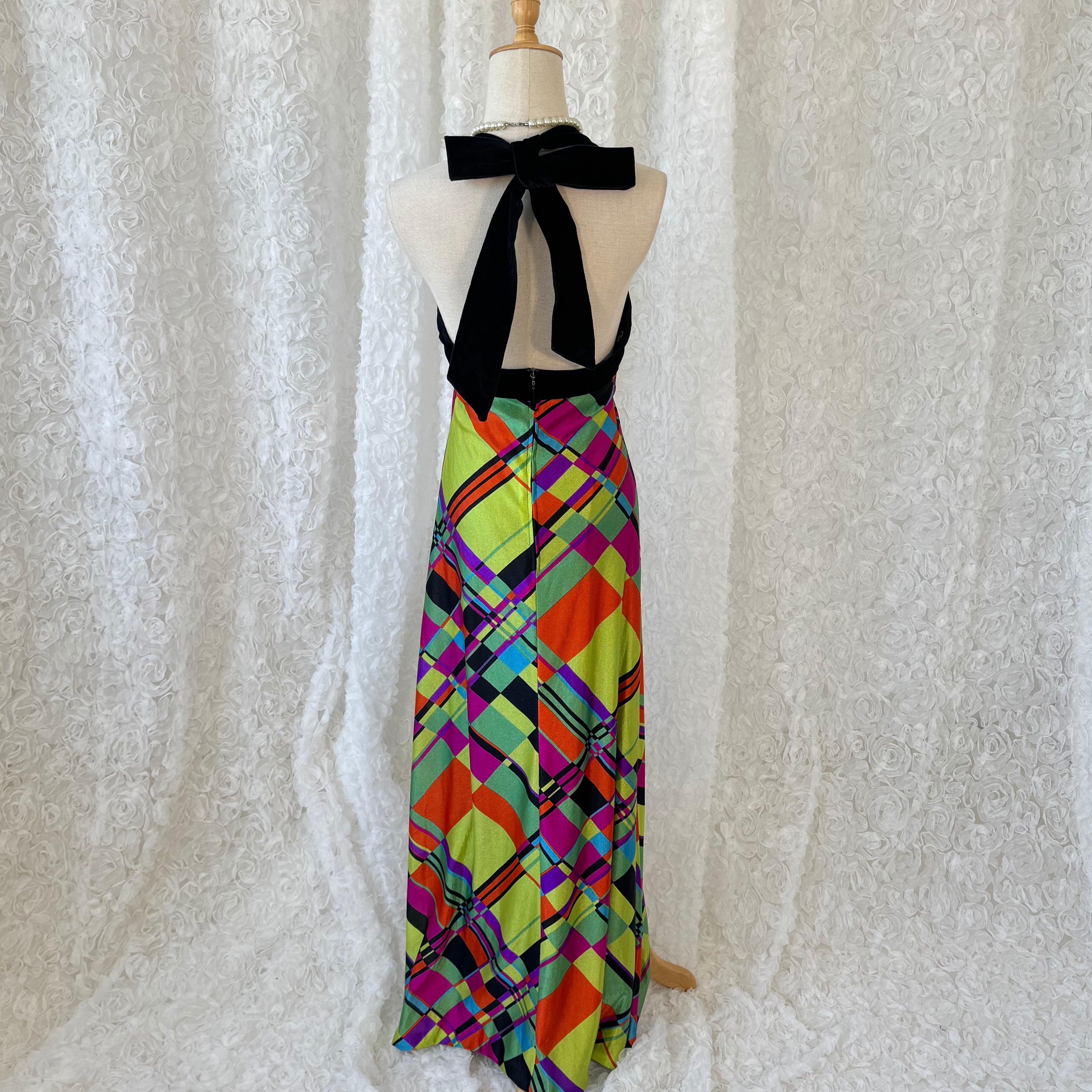 80s CANDA INTERNATIONAL ヴィンテージ ホルターネック ロングワンピース カラフルチェック ベロアトップ バックリボン マキシ丈 レトロドレス