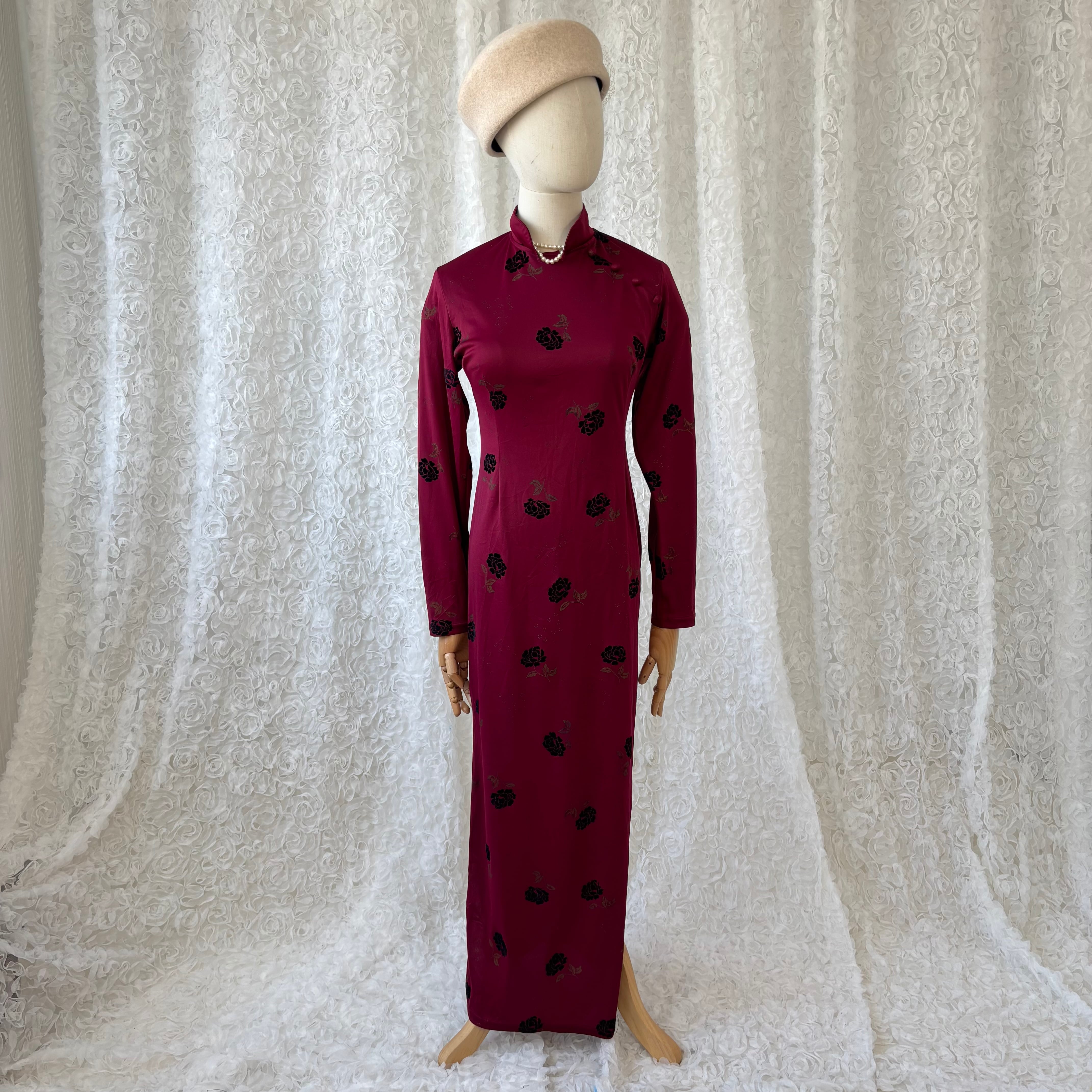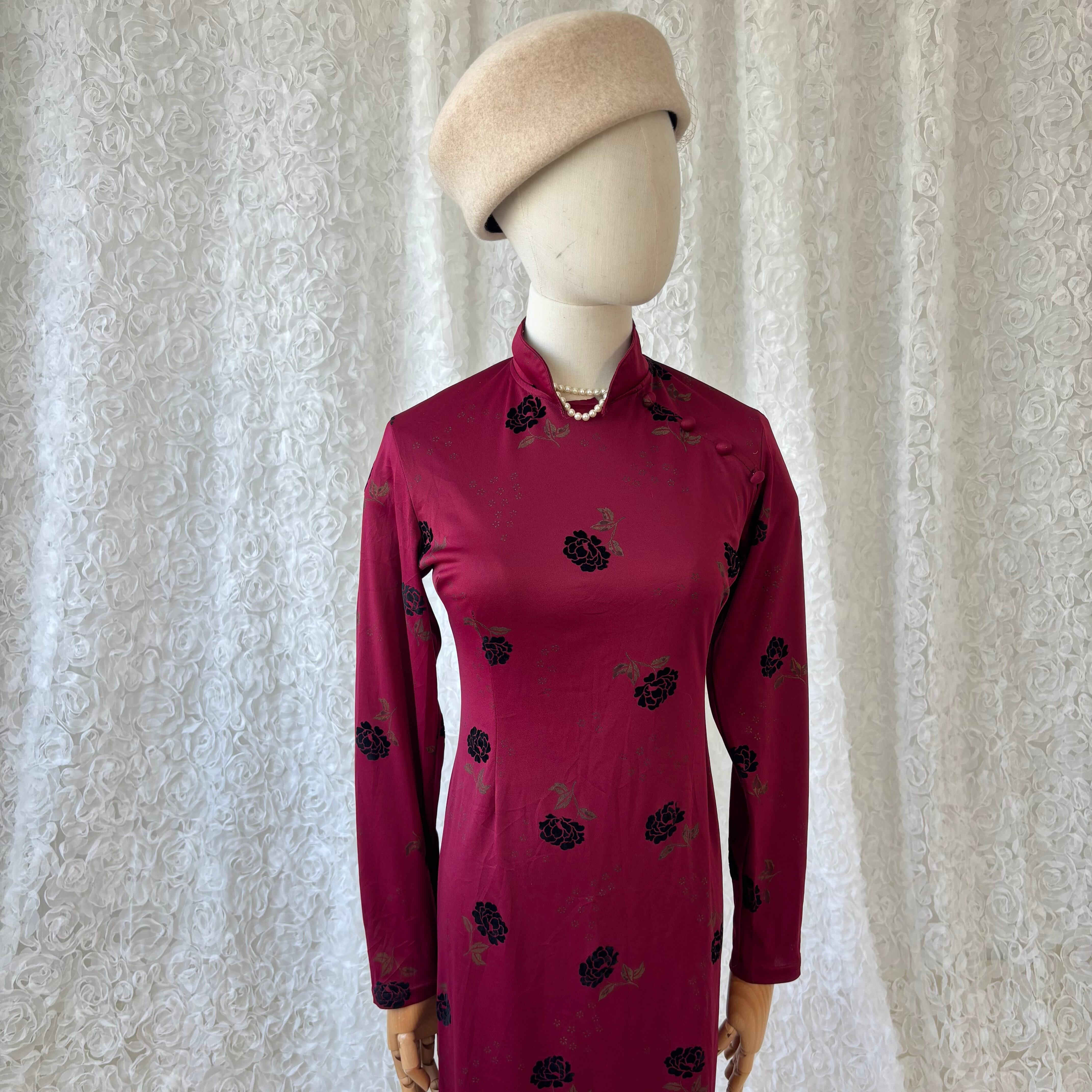深みのあるボルドーレッドカラーにシックな花柄が映えるチャイナドレス。