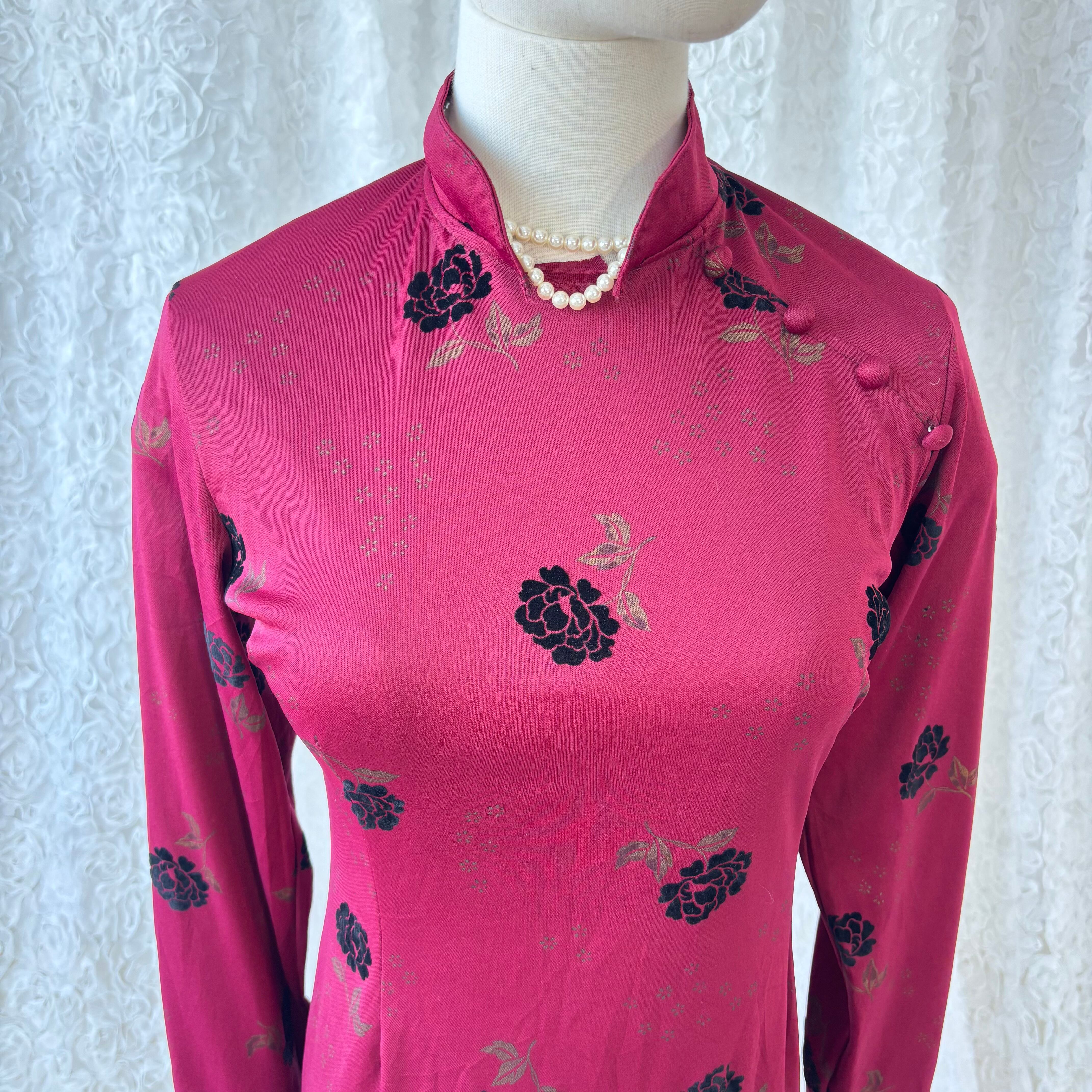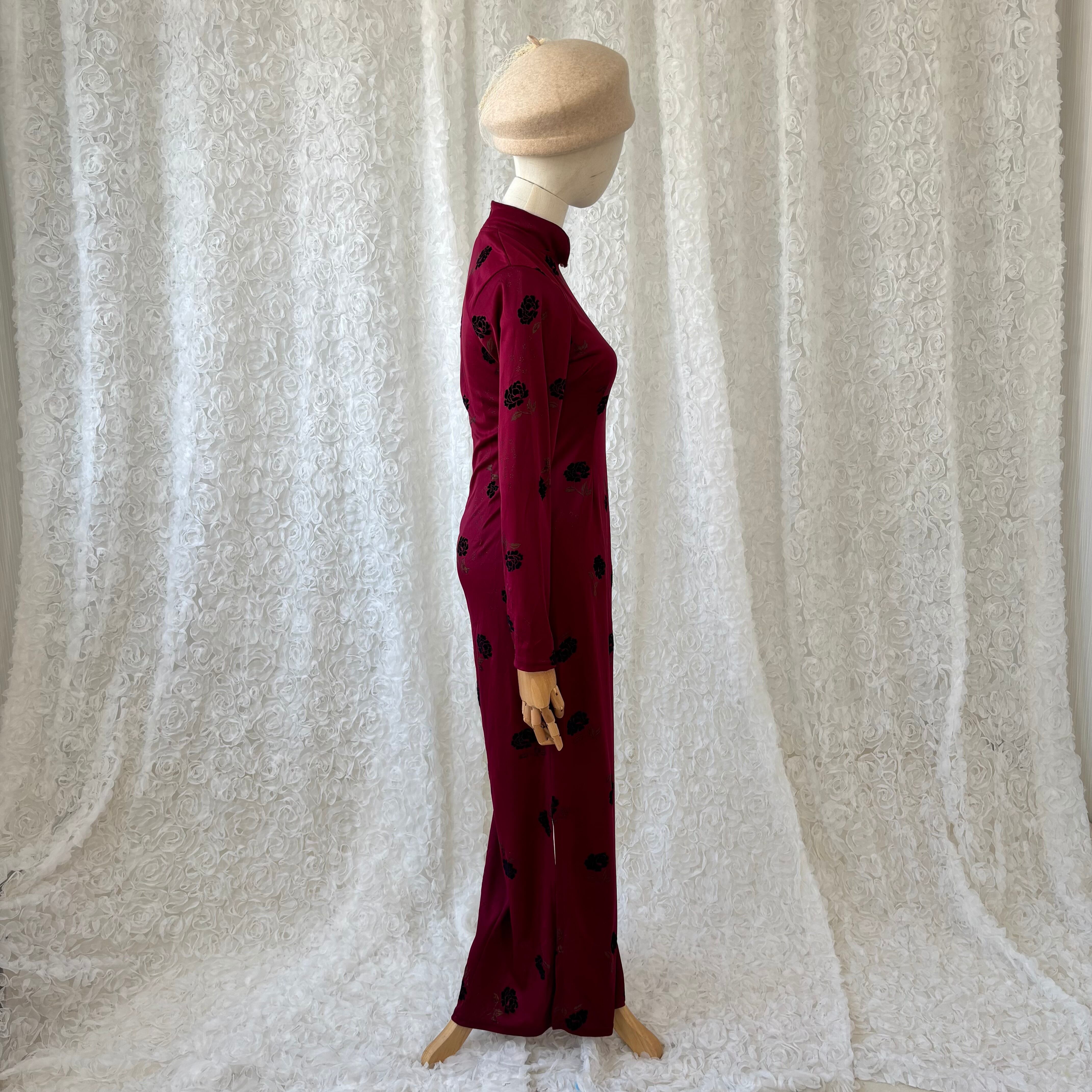 チャイナドレス ロングワンピース 赤 花柄 長袖 マキシ丈 ヴィンテージ フランス製 チャイナ服 スリット タイト レディース 上品