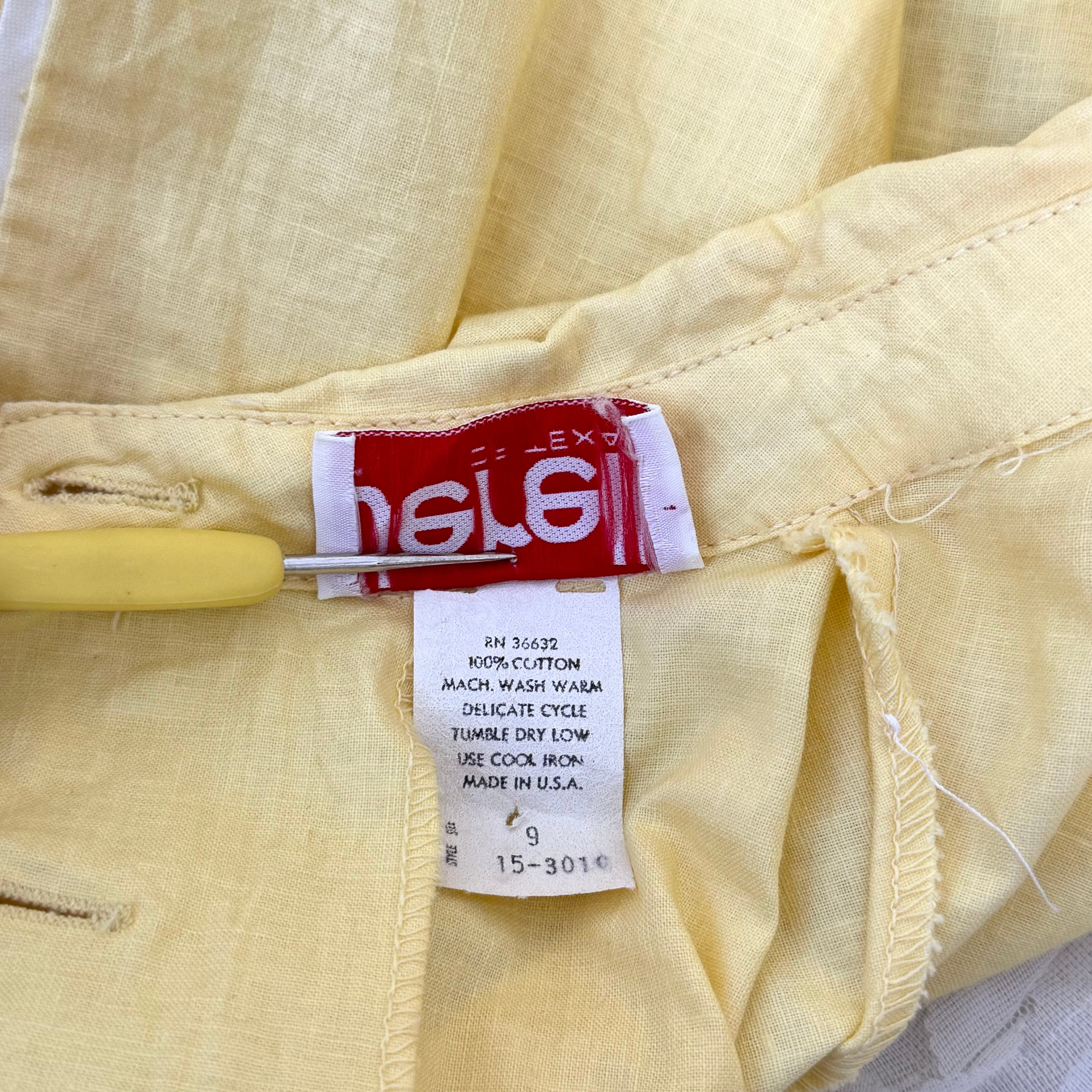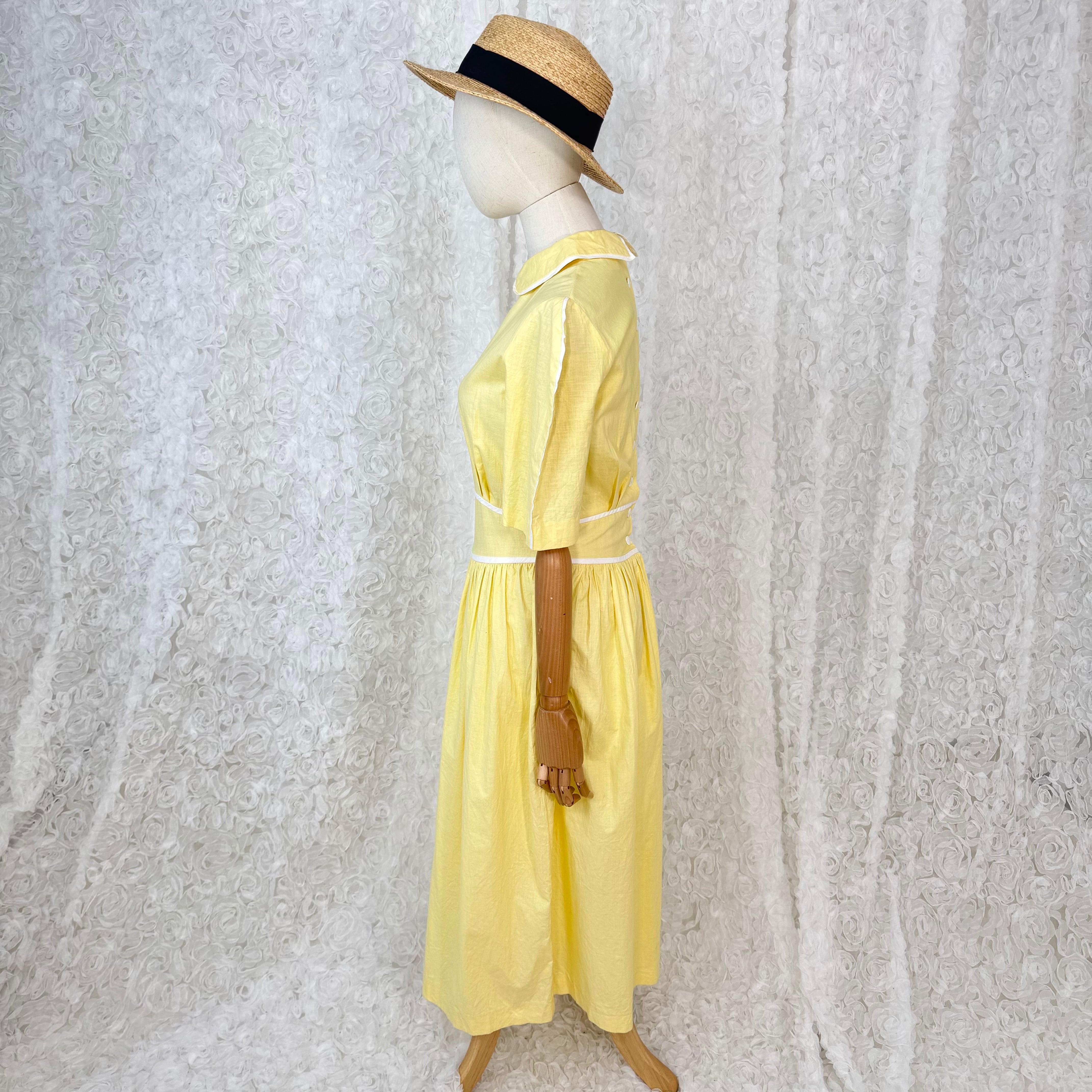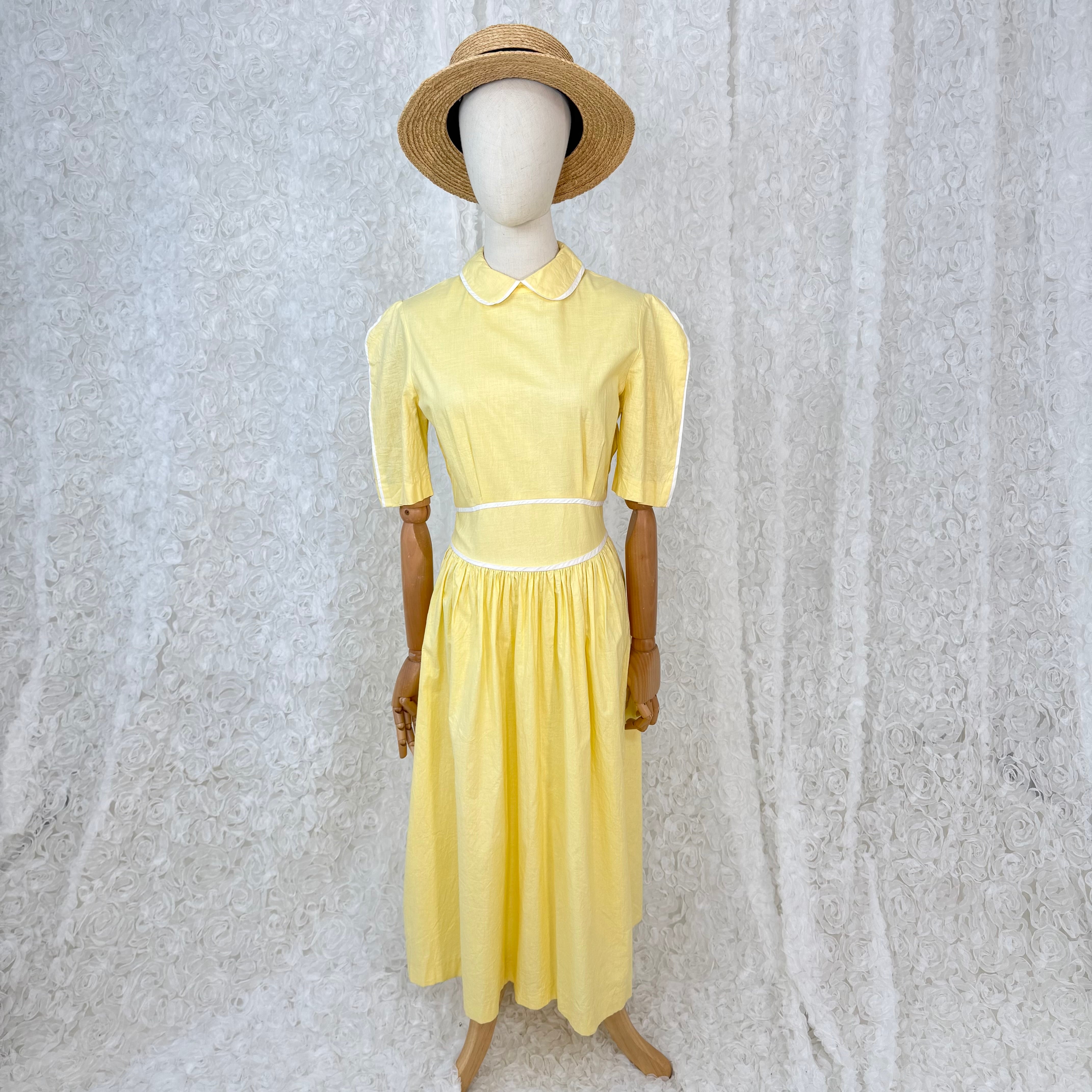Jerell of Texas USA製 コットンワンピース イエロー パフスリーブ 半袖 襟付き ウエスト切替 ギャザー フレア ヴィンテージ 春夏 レトロ 上品
