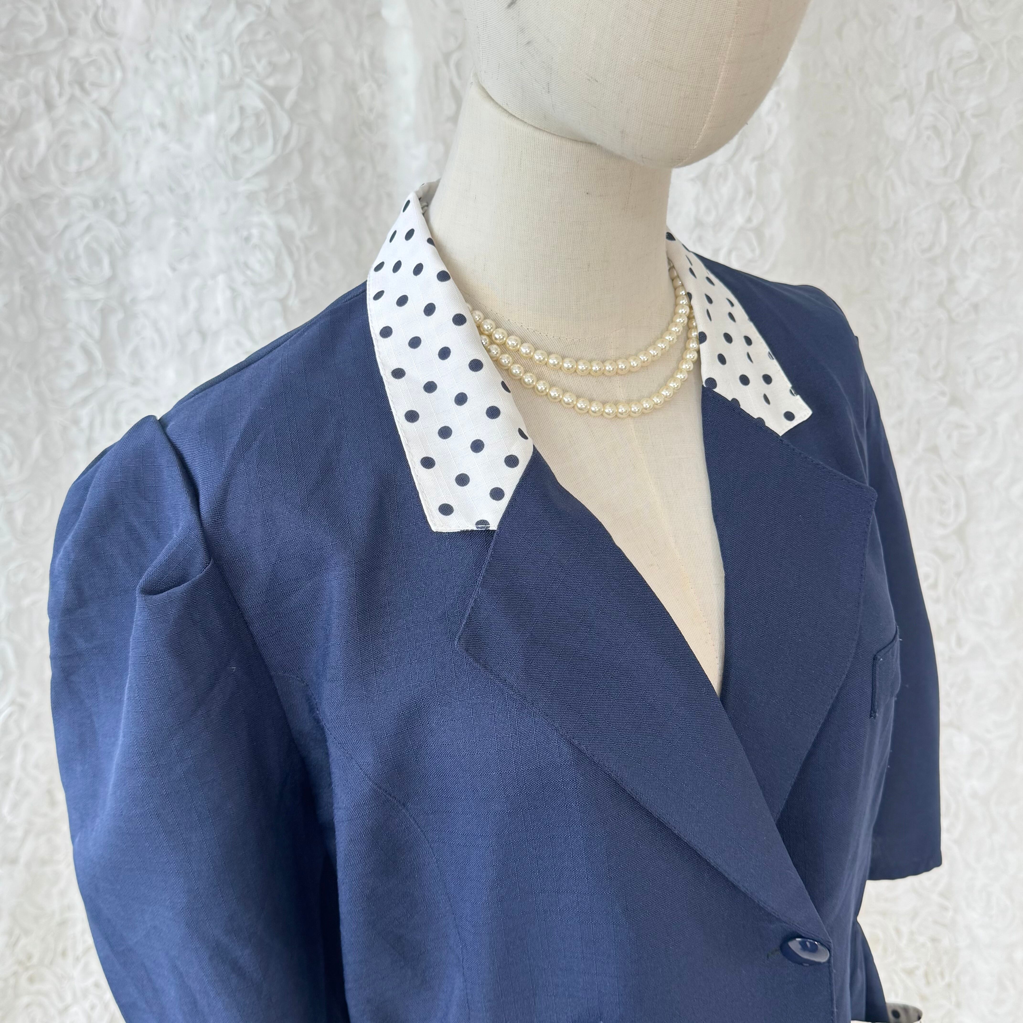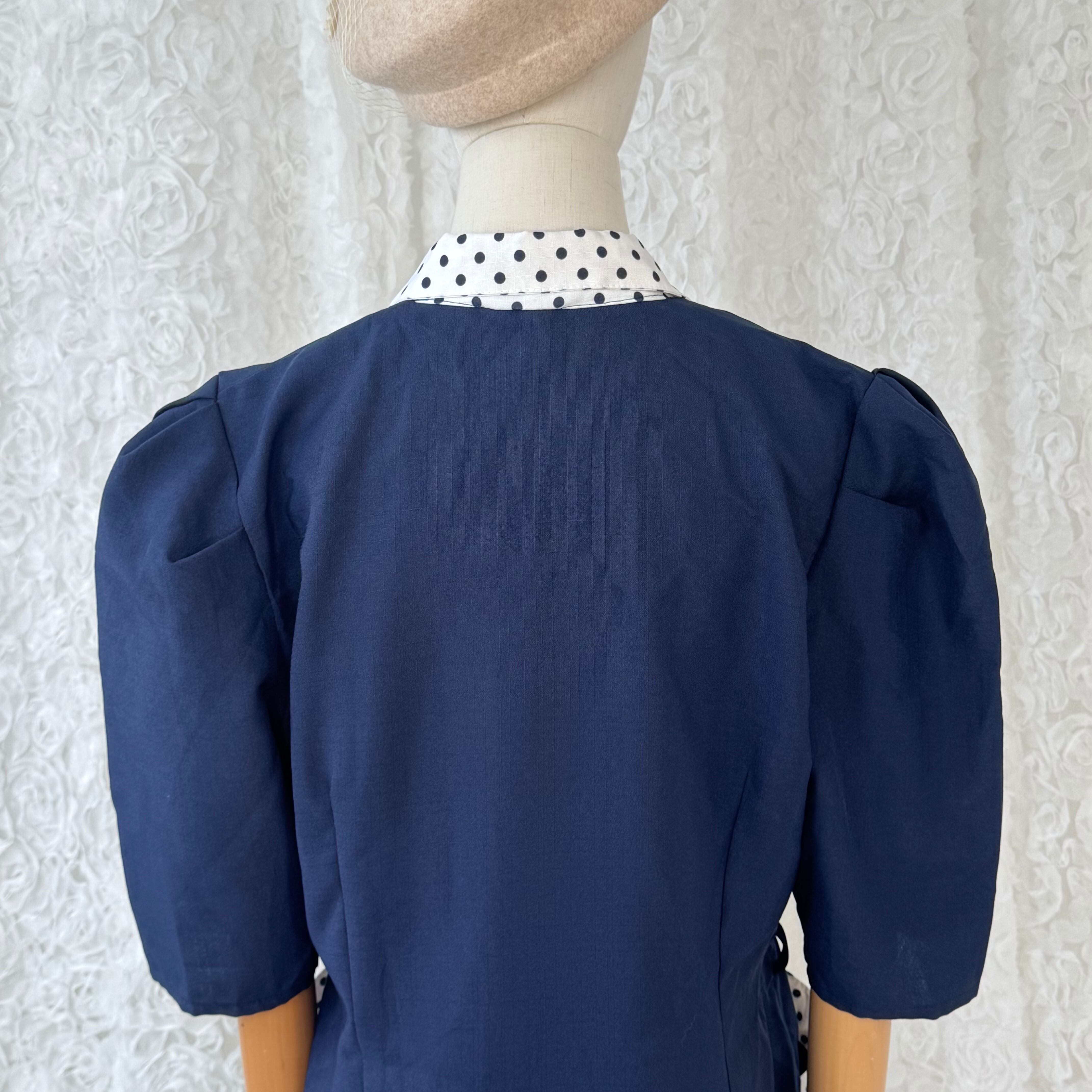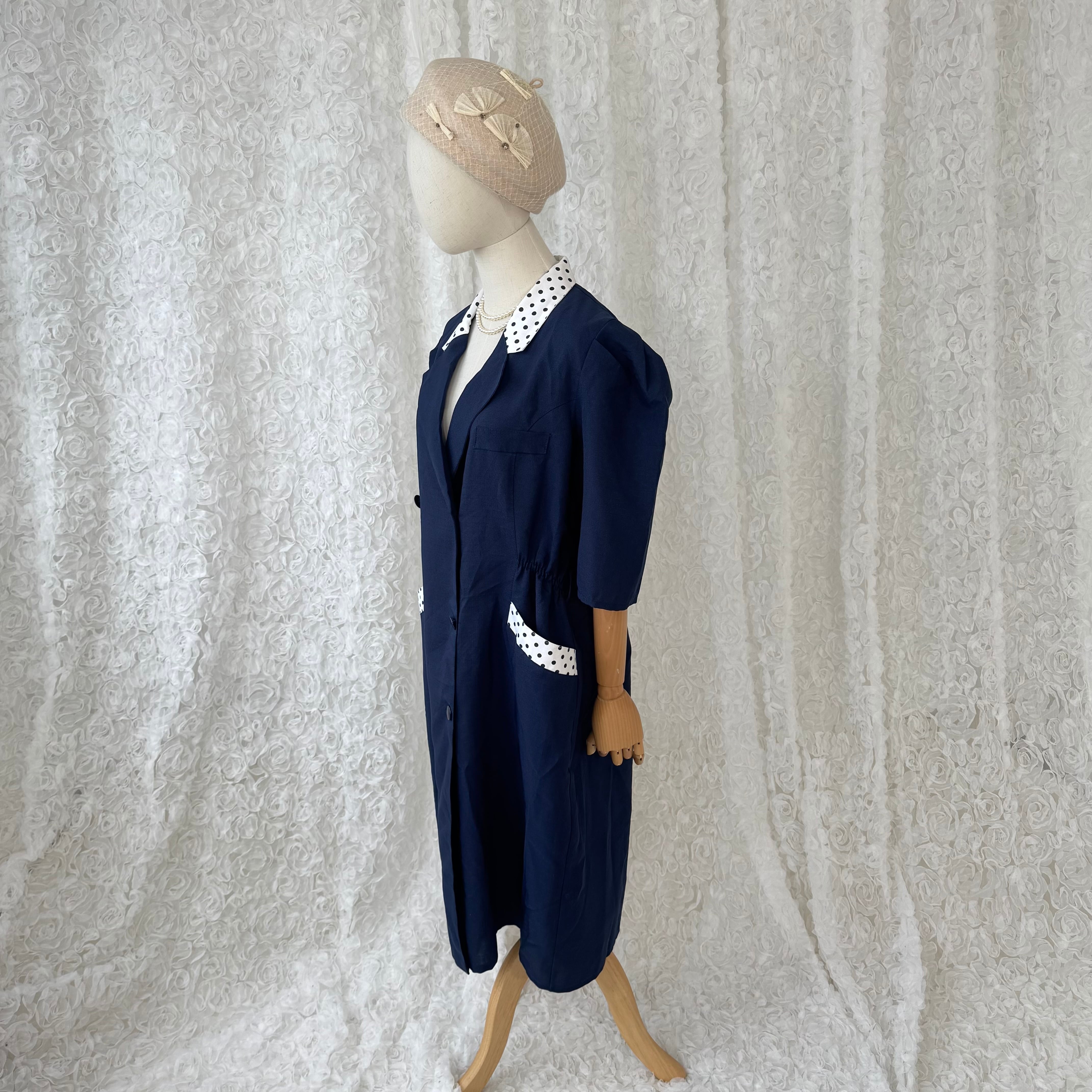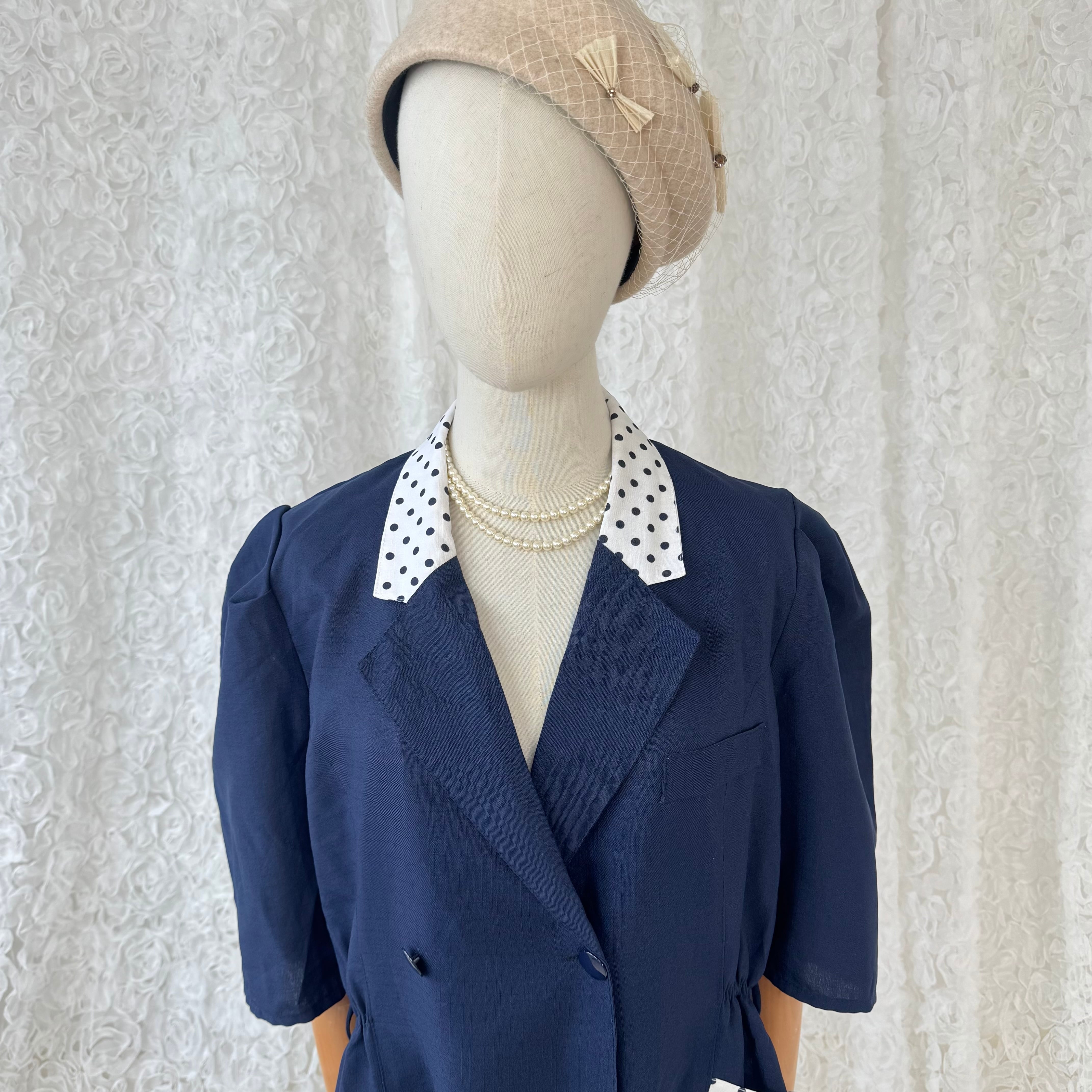 made in France ヴィンテージ ネイビー ドット襟 テーラードカラーワンピース 半袖 ロング 羽織り風 レトロ クラシカル ゆったり ポケット付き