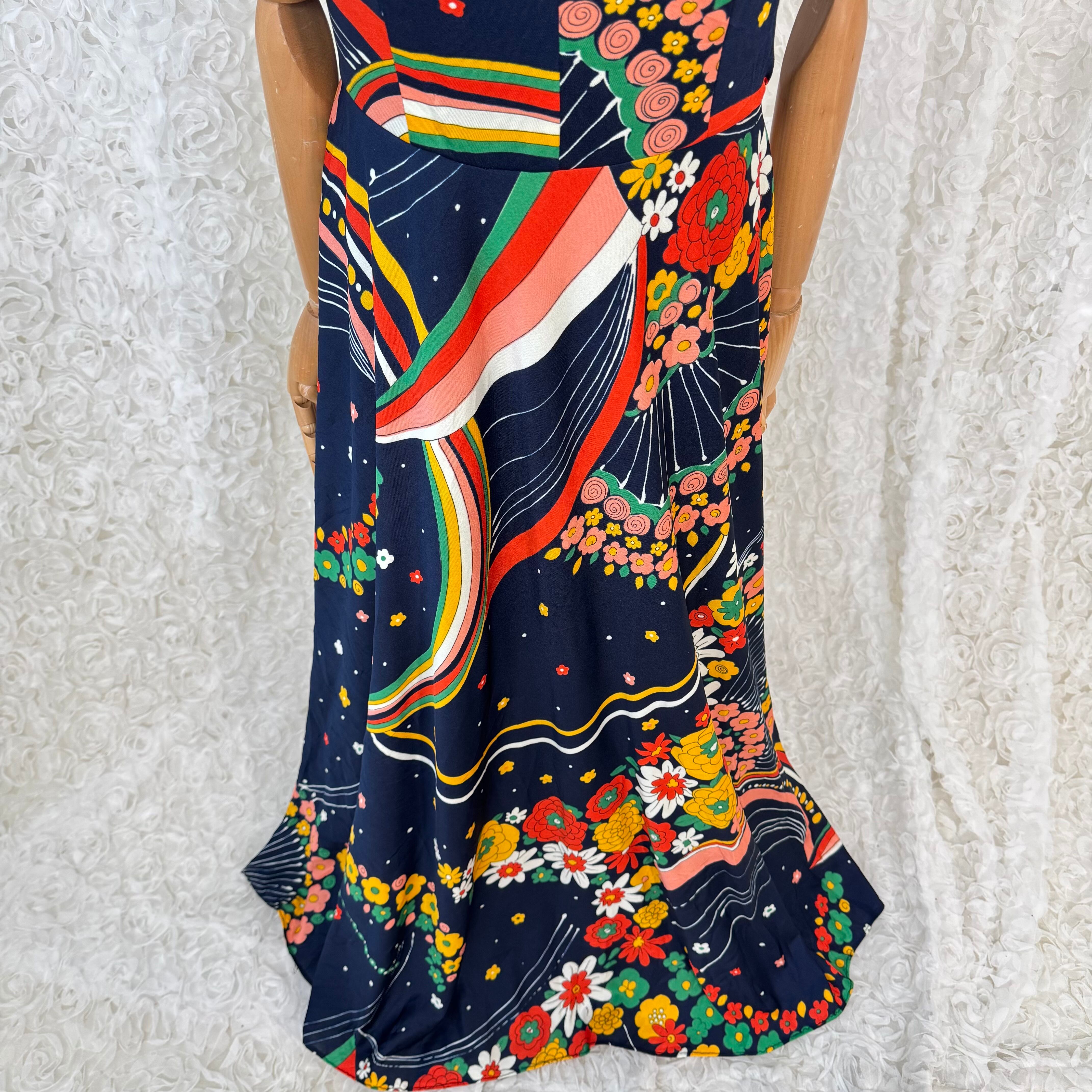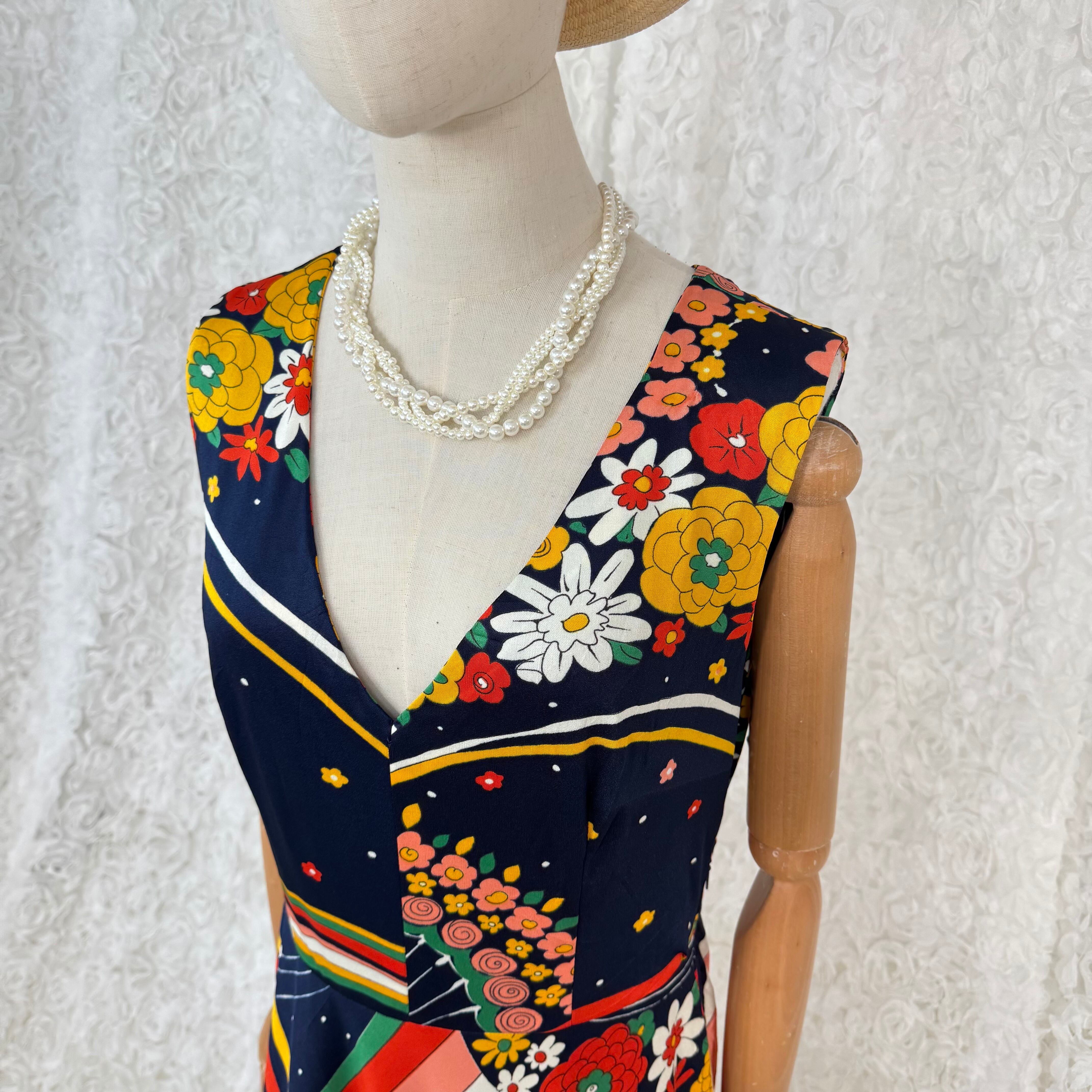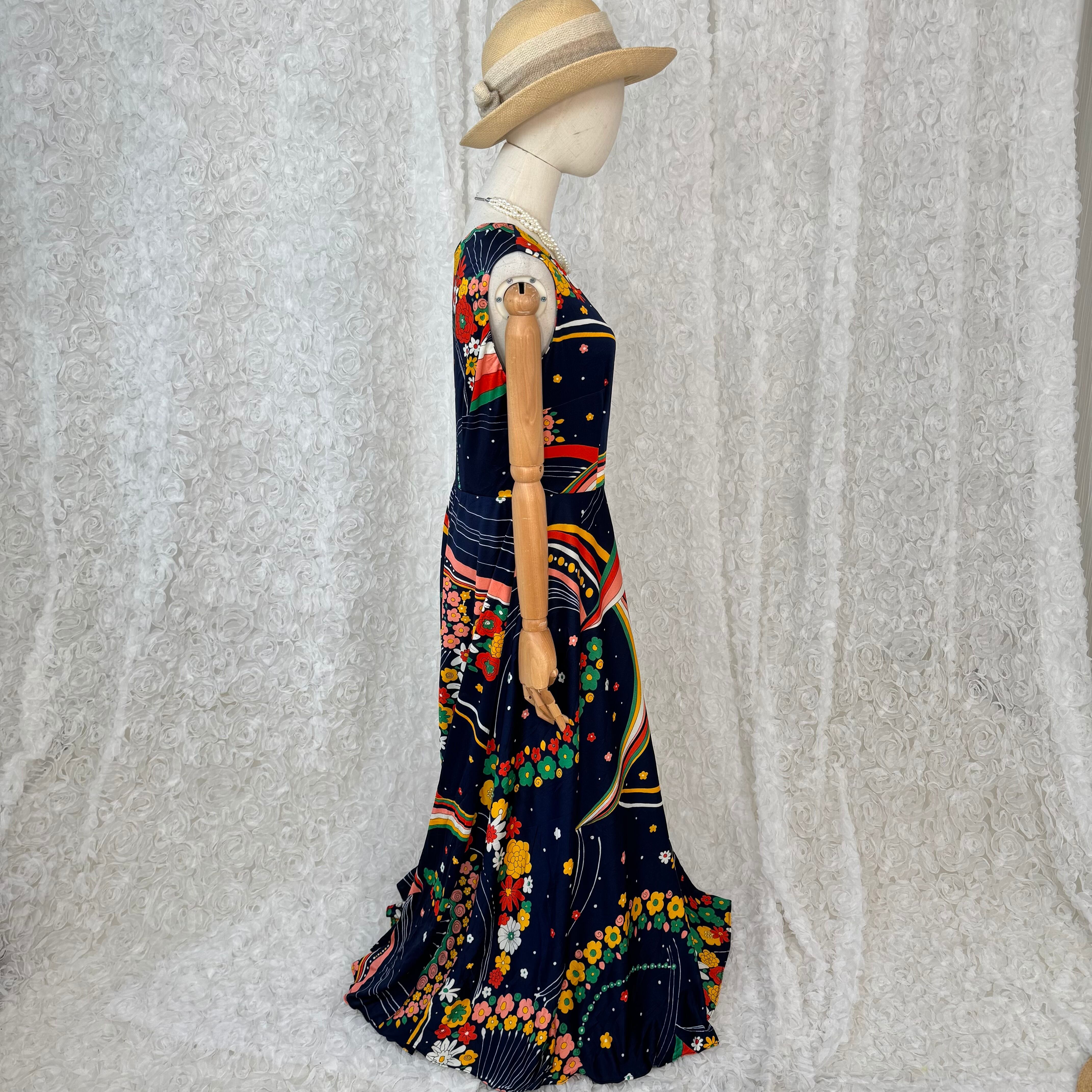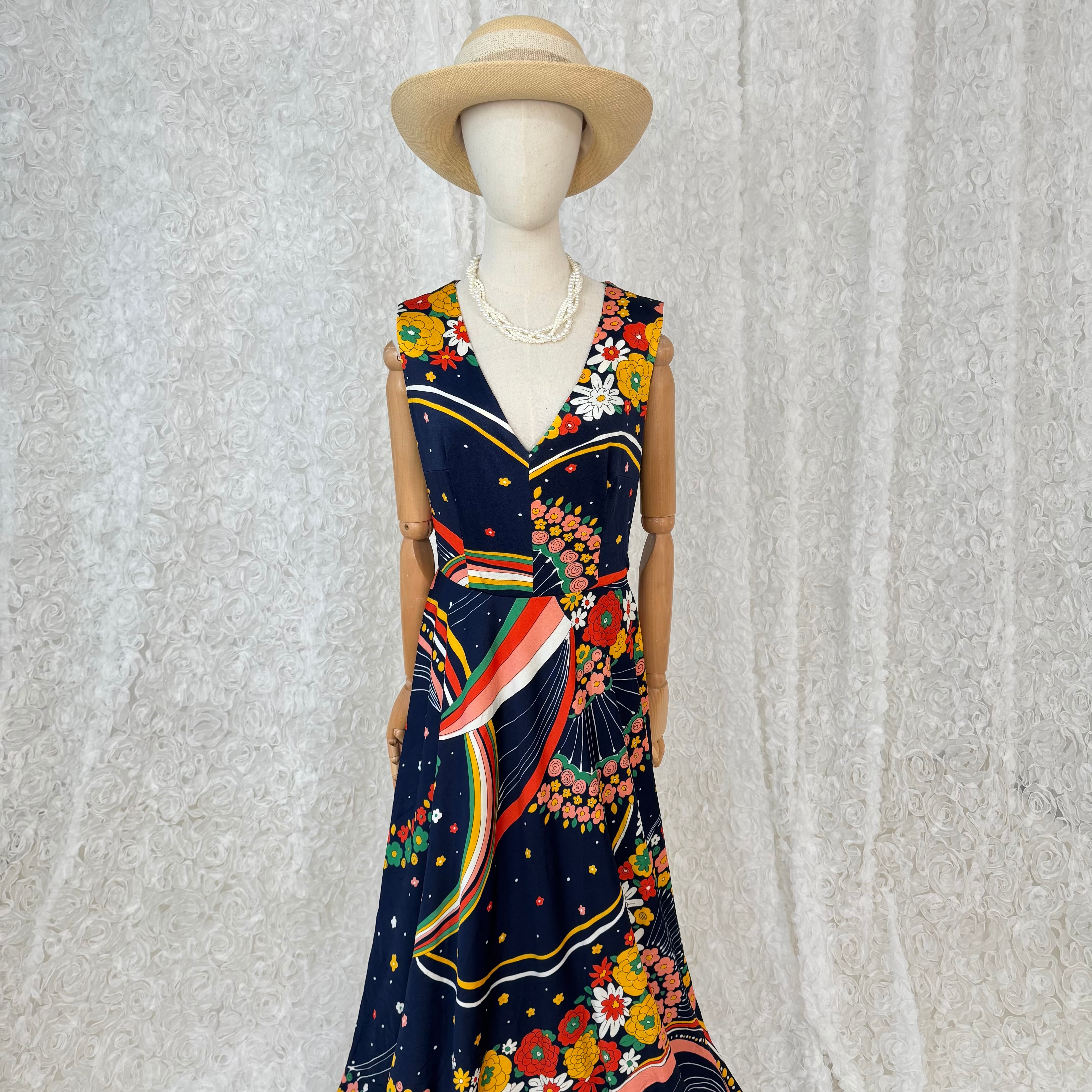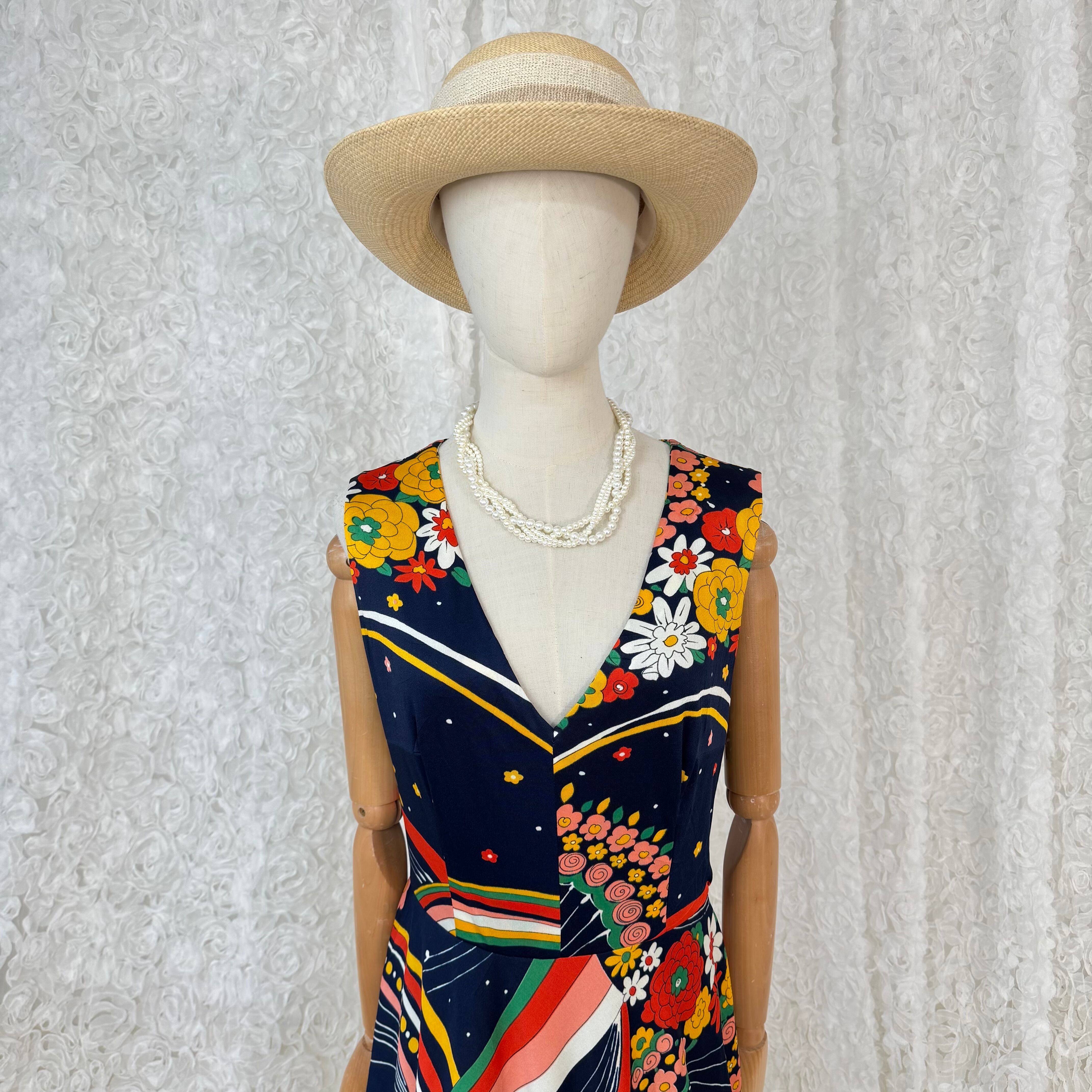 ヴィンテージ ネイビー 花柄 マキシワンピース ノースリーブ マキシ丈 フレアAライン レトロな総柄 カラフル配色