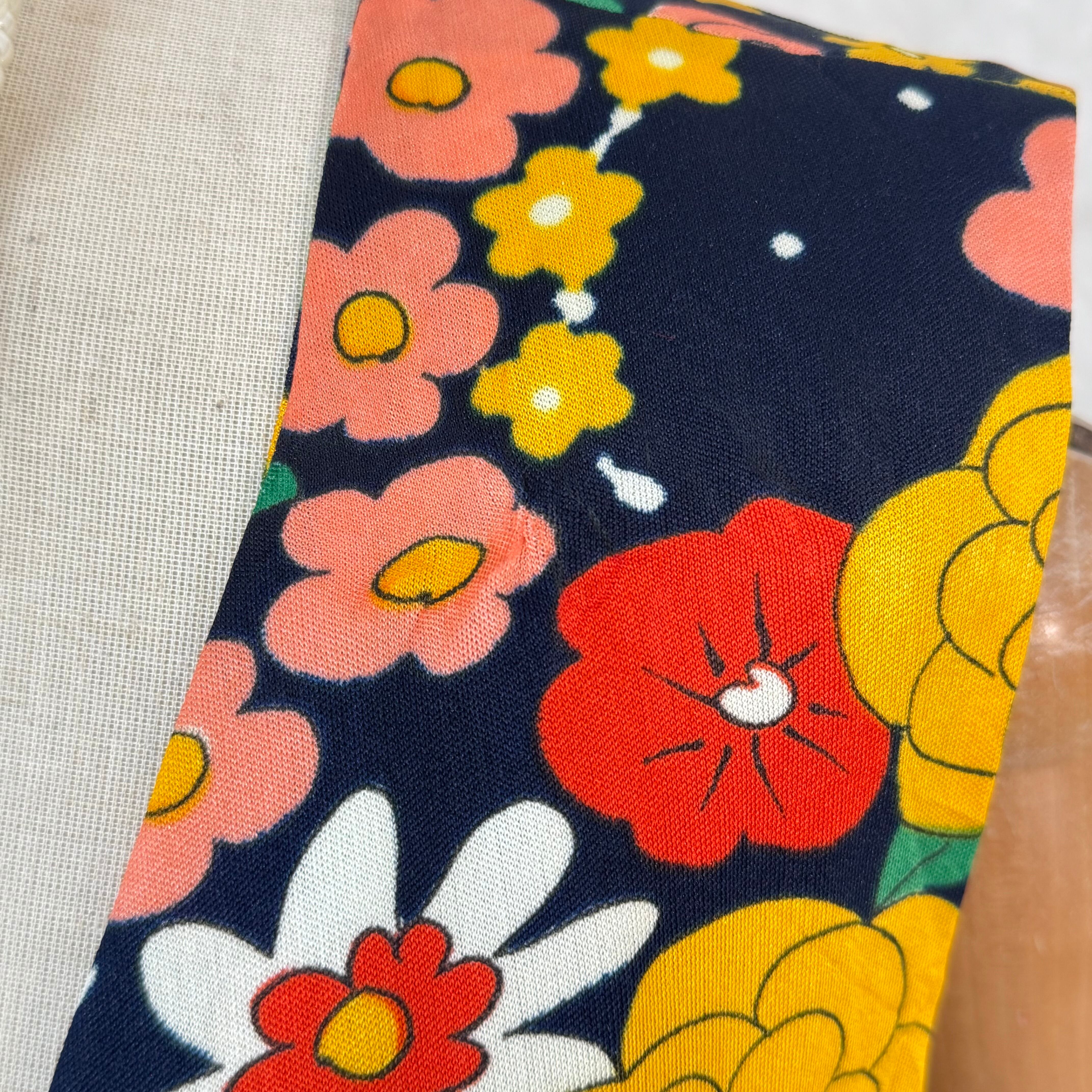 華やかな花柄とカラフルなラインデザインが目を惹くヴィンテージワンピース。