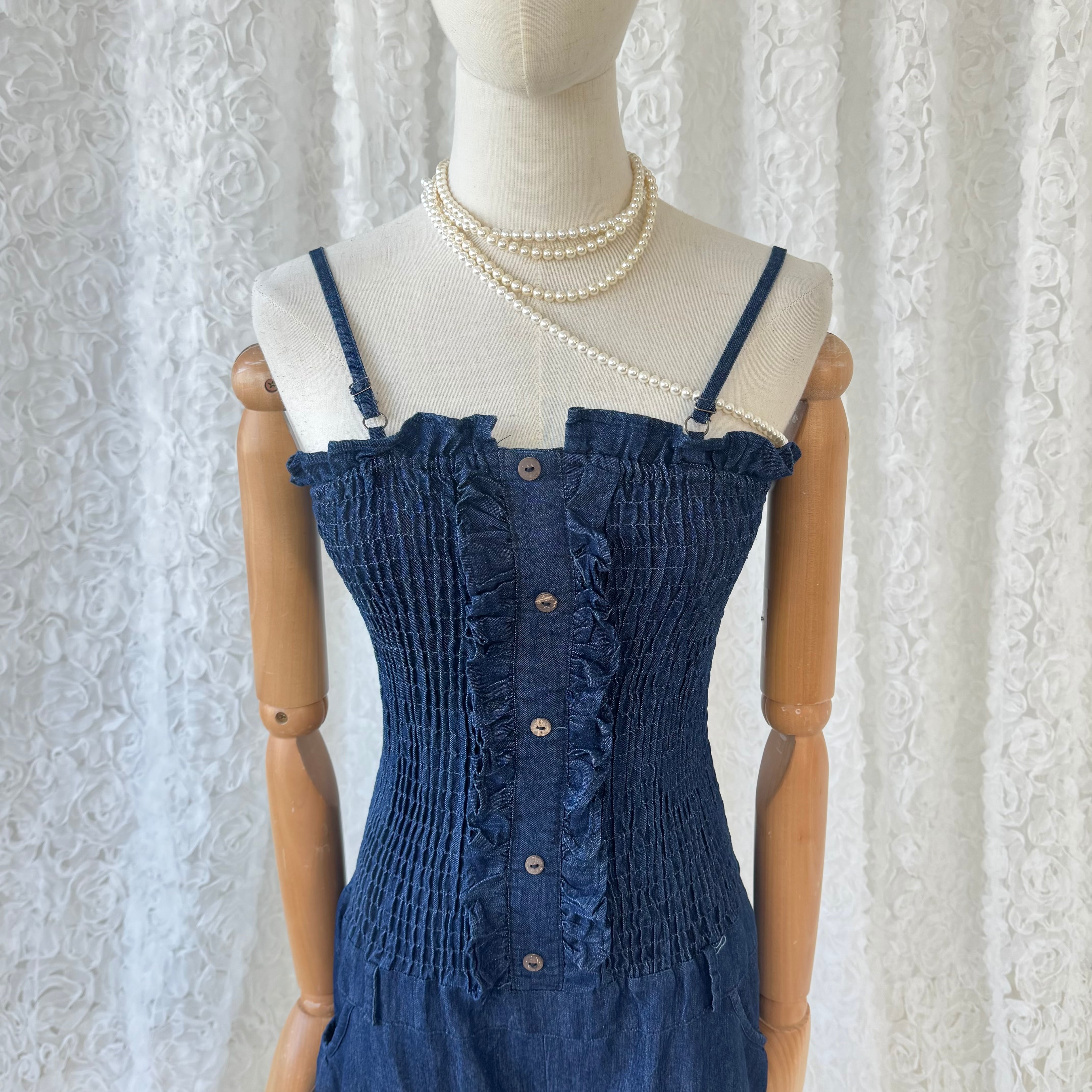 ヴィンテージ デニムサロペット フリルデザイン シャーリング キャミ オールインワン ショート丈 ネイビー カジュアルレトロ