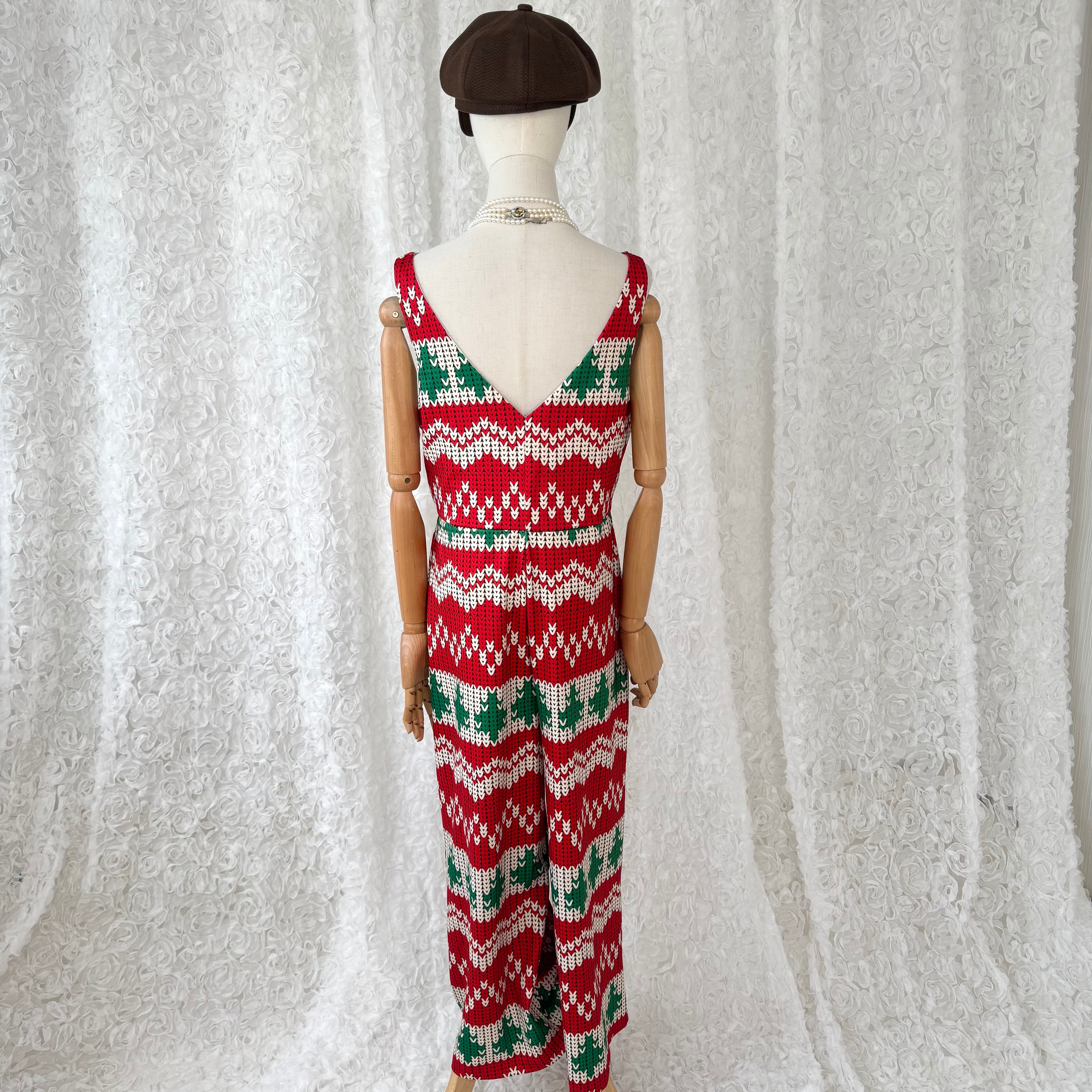 インパクトのあるニット風のイカット柄デザインが目を惹くオールインワン。