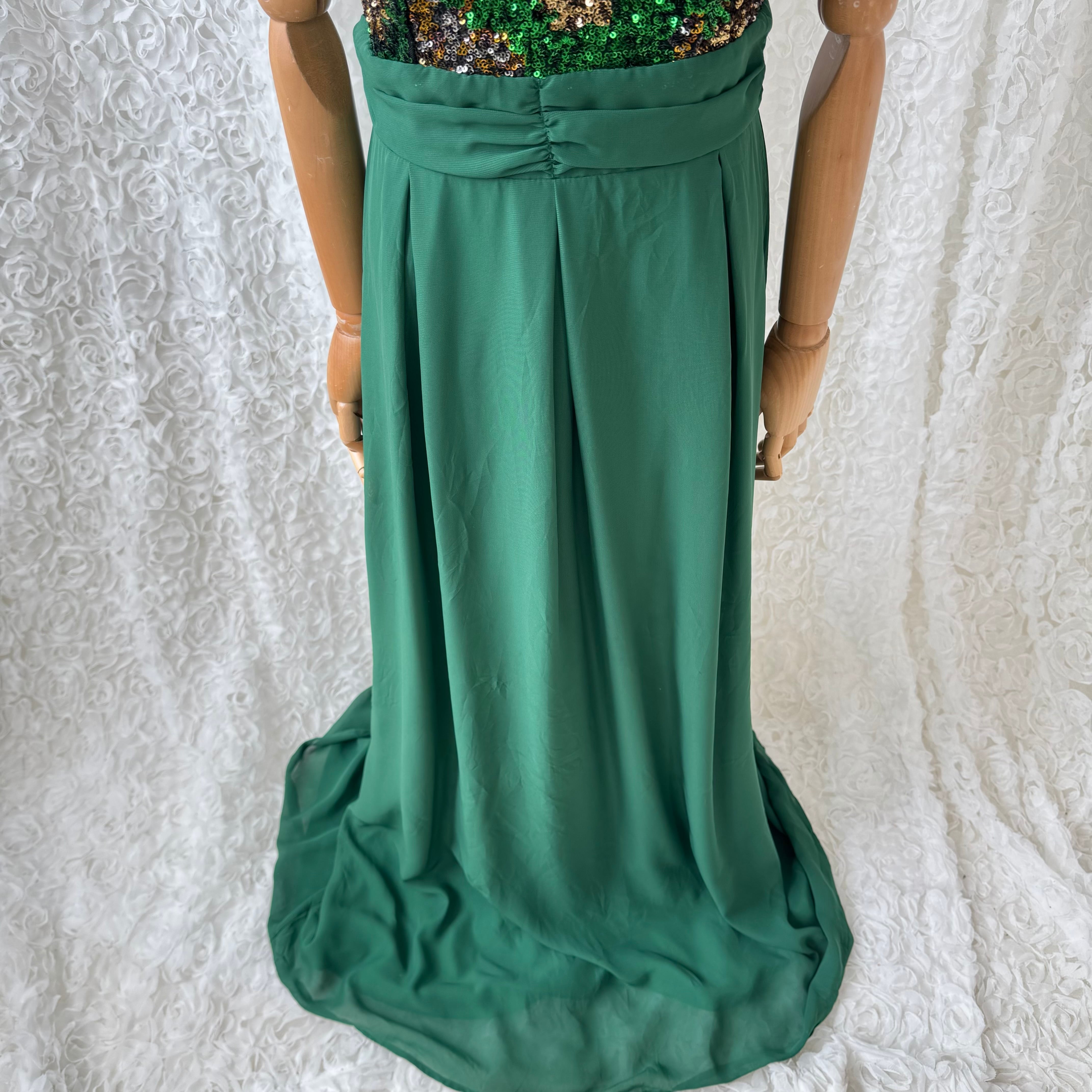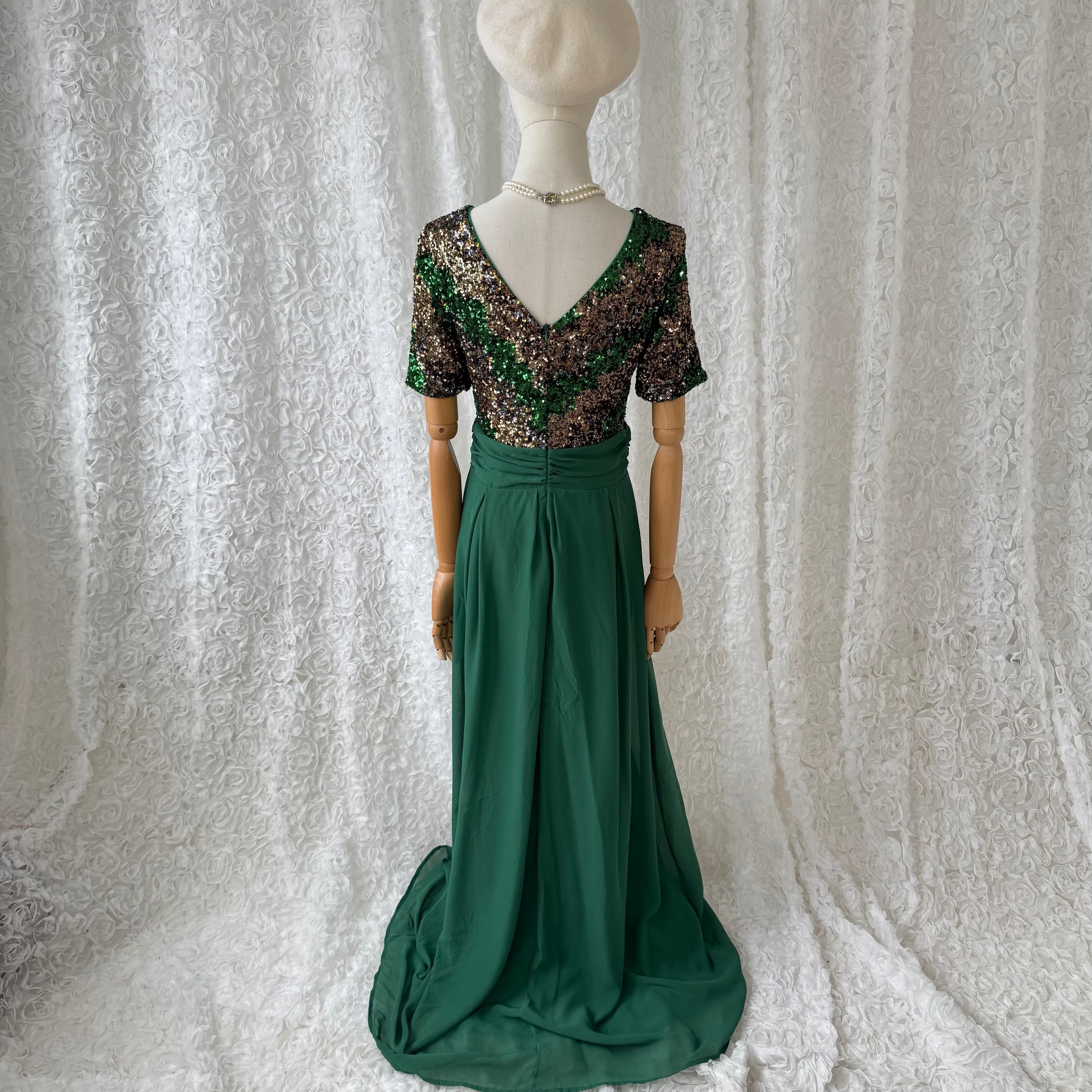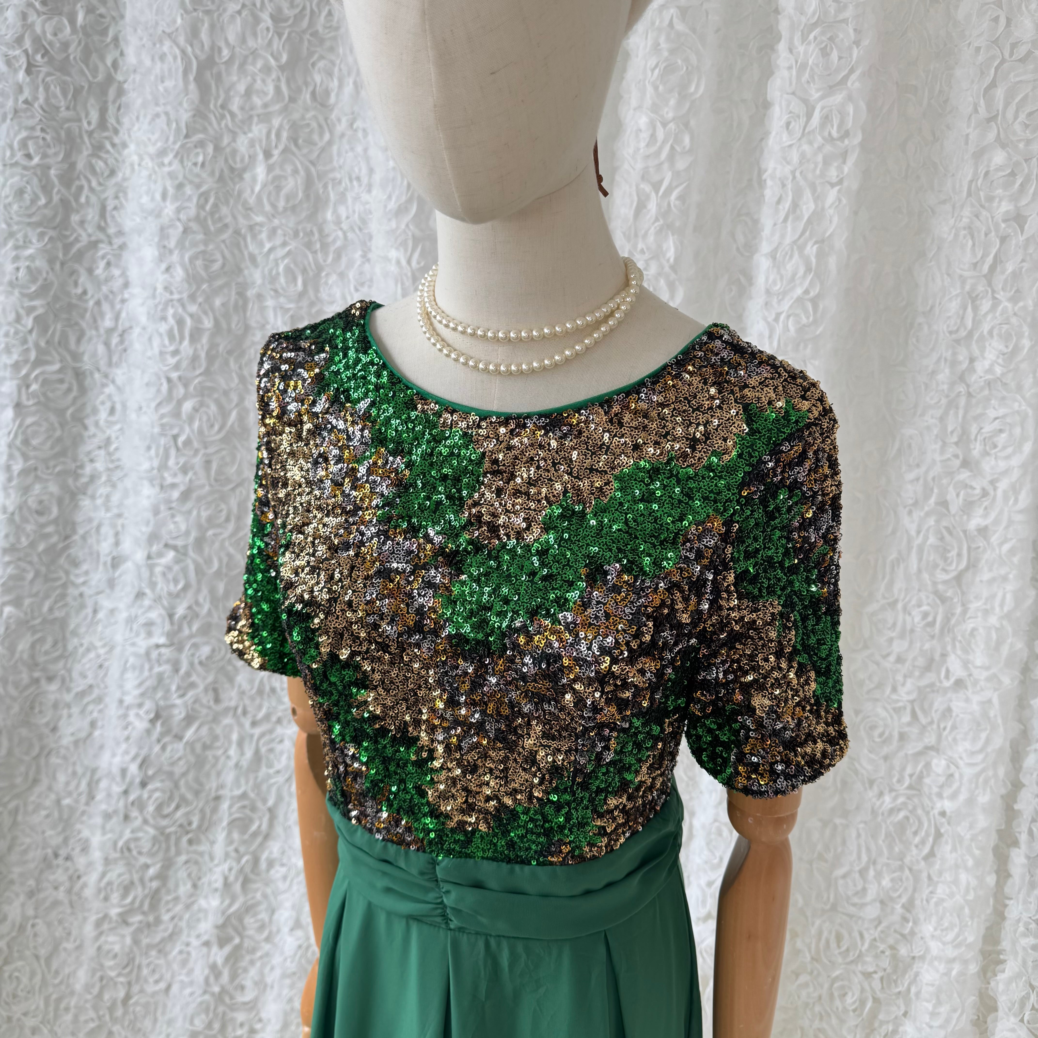 グリーン スパンコール ワンピース マキシ丈 半袖 ドレス Vバック フレア 光沢 エレガント パーティー フォーマル ヴィンテージ