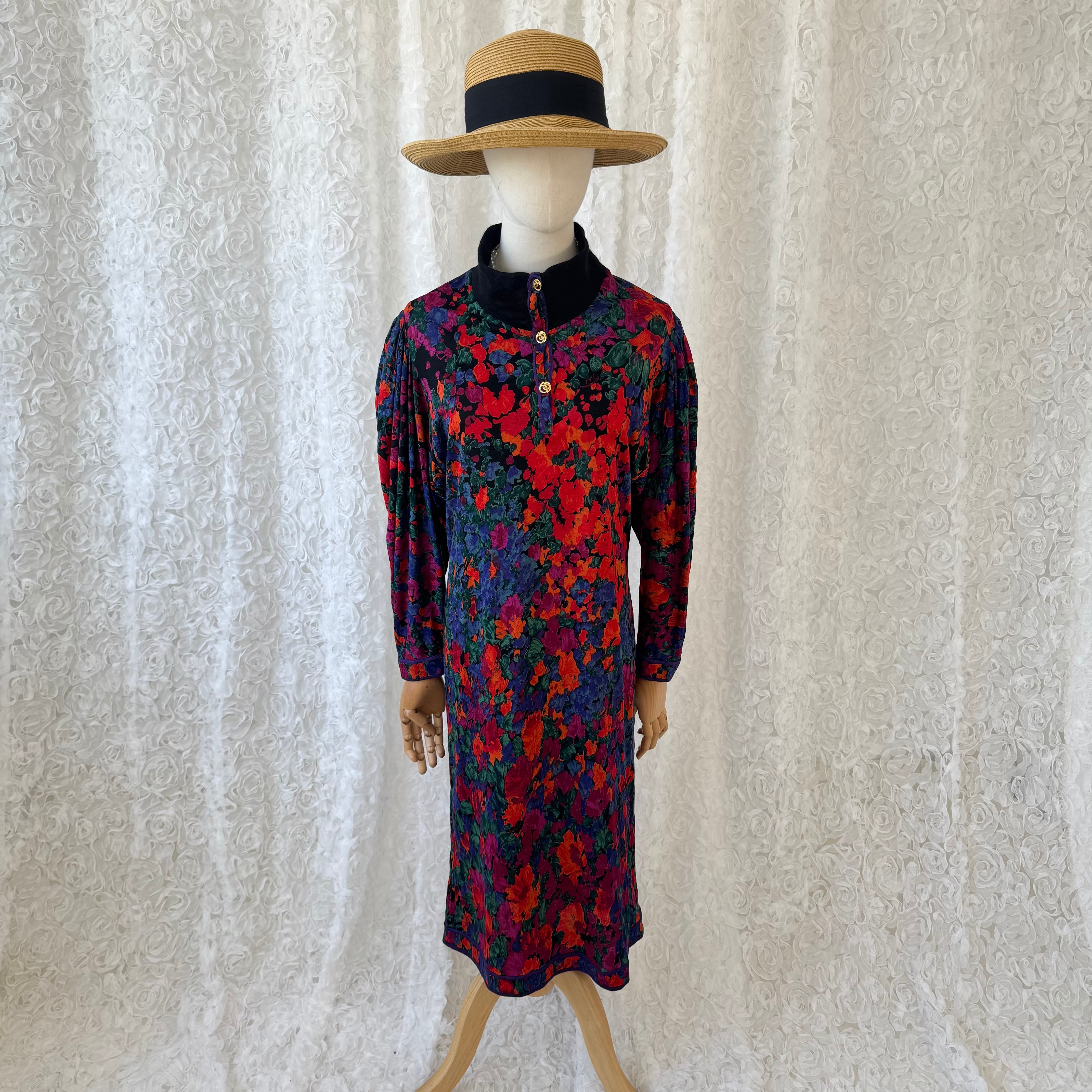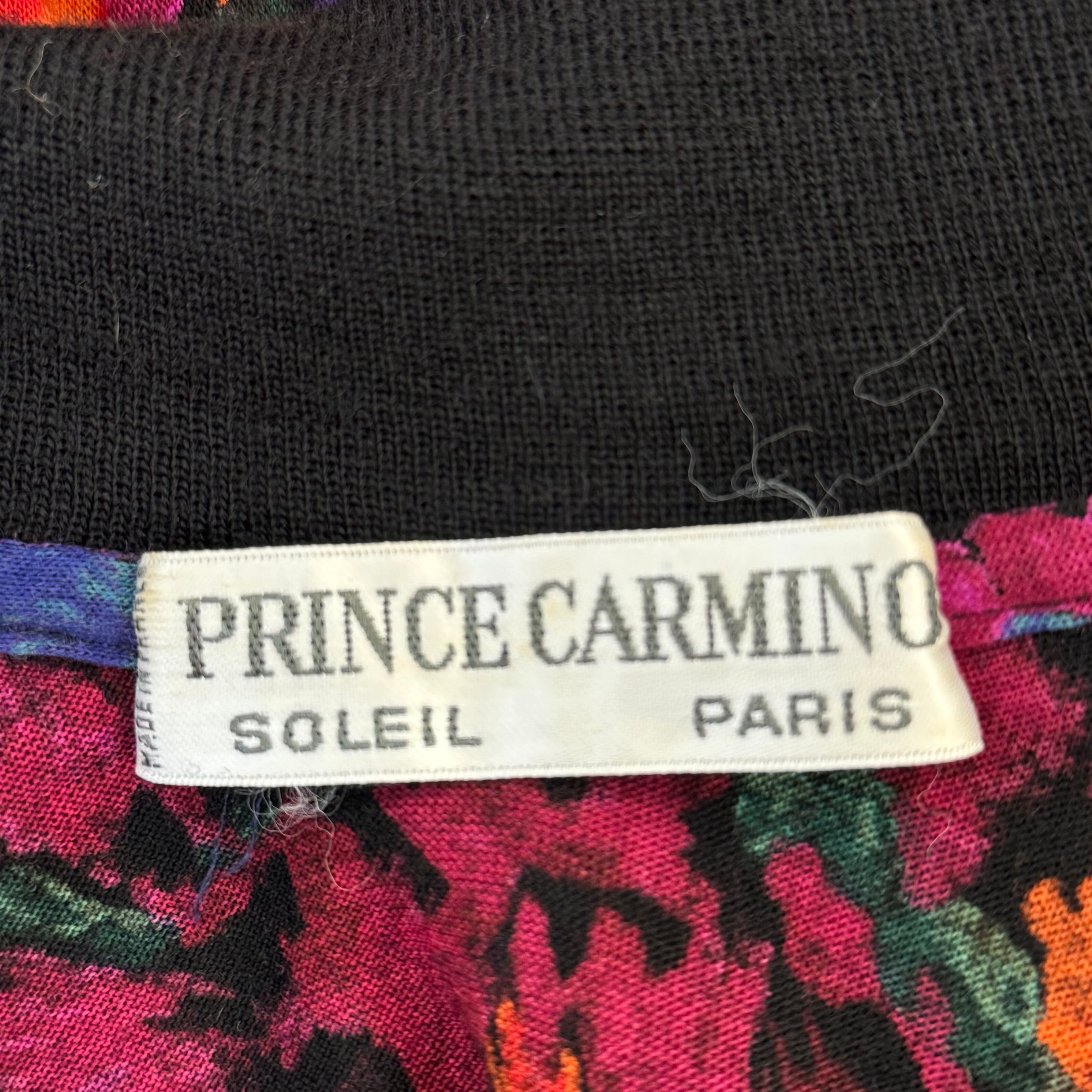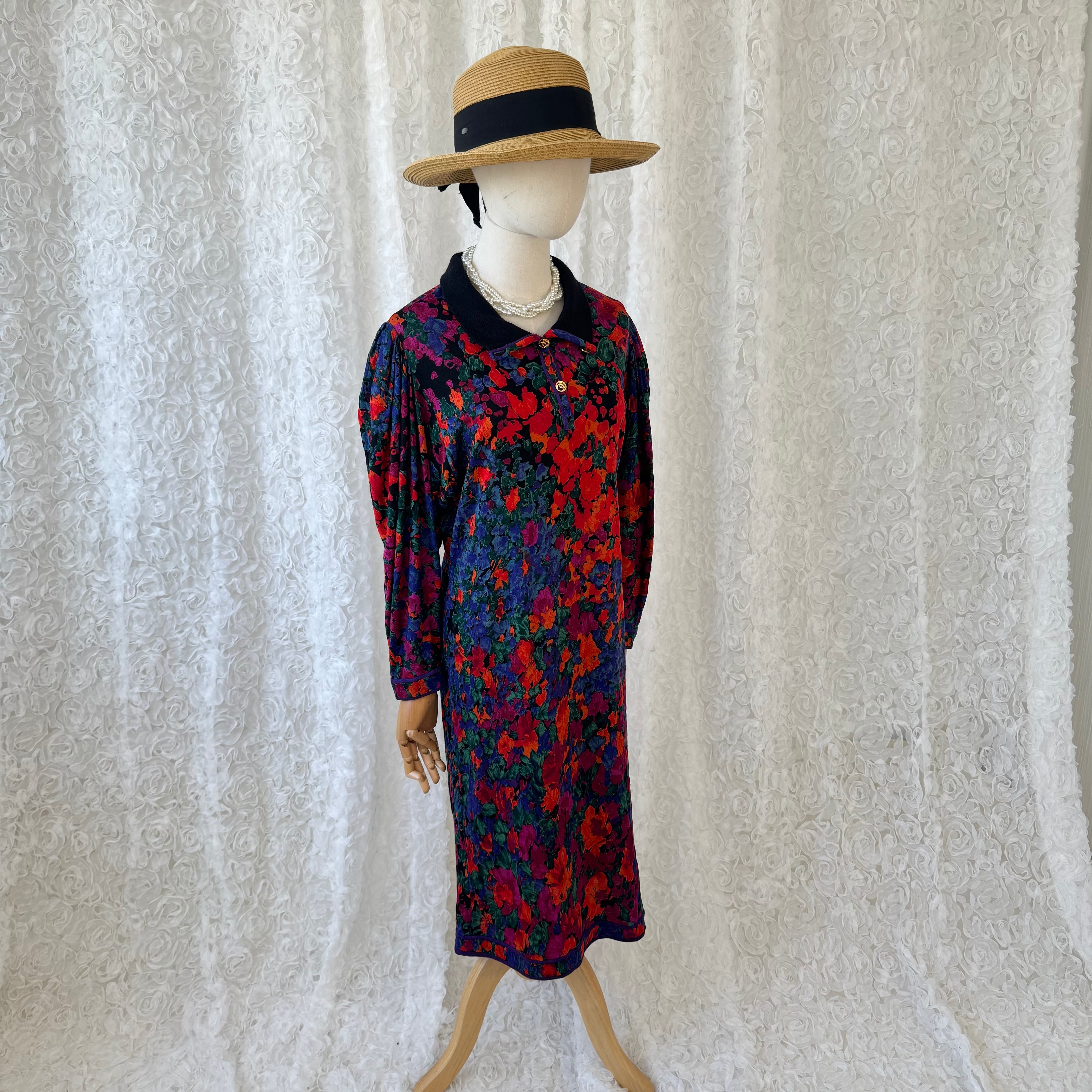 PRINCE CARMINO PARIS ヴィンテージ 花柄ワンピース 長袖 ミディ丈 ポロカラー 2WAY襟 総柄 フレンチレトロ 上品 華やか 伸縮素材