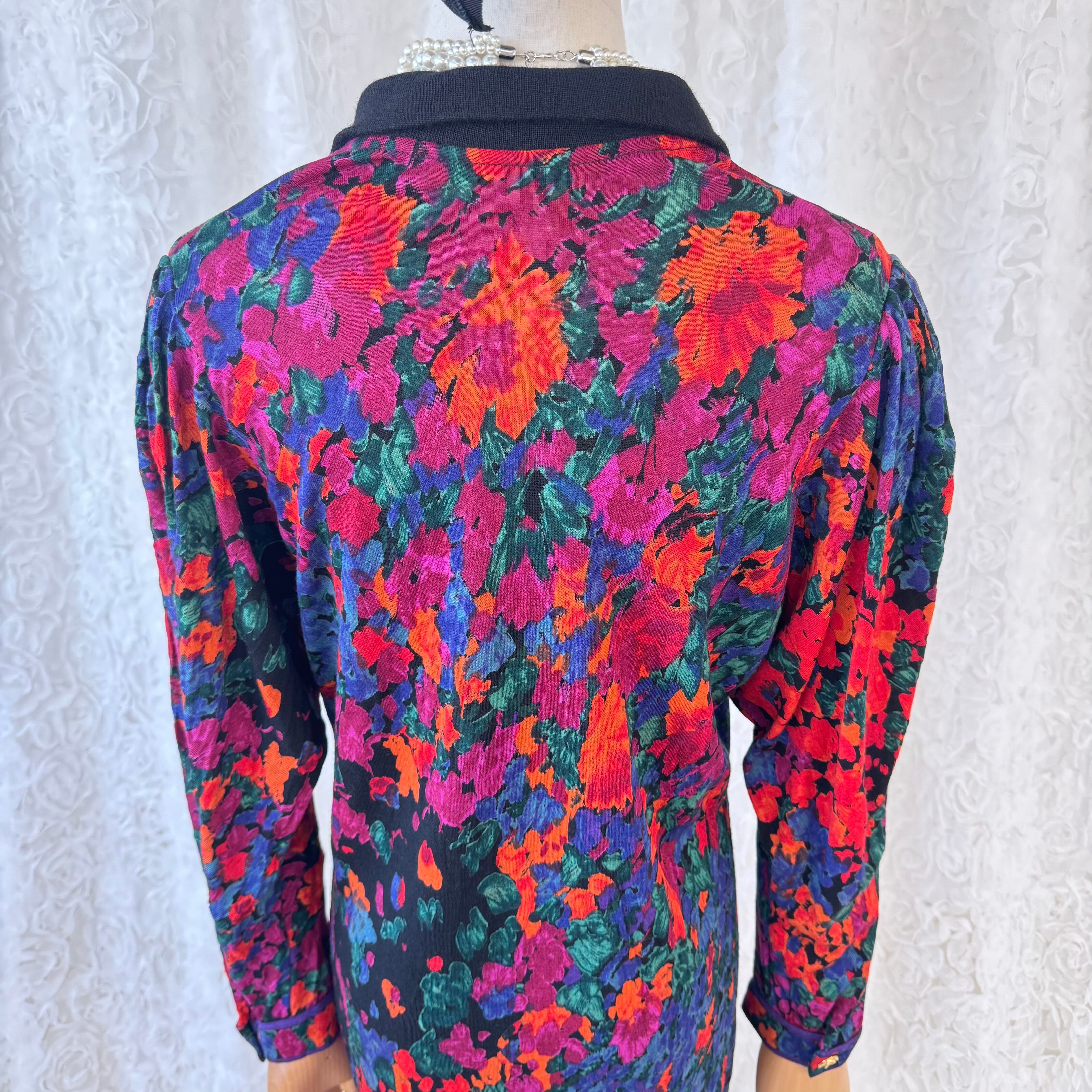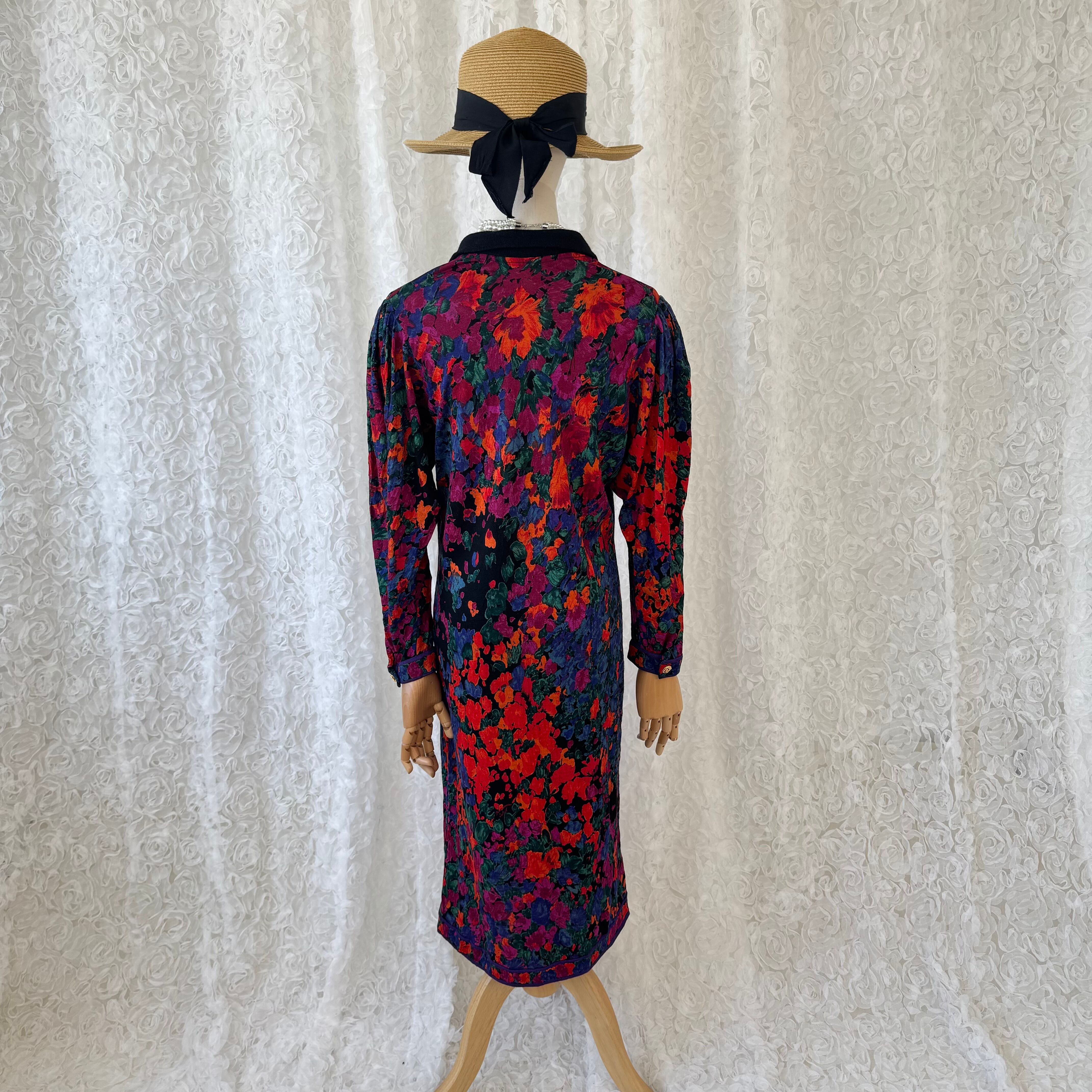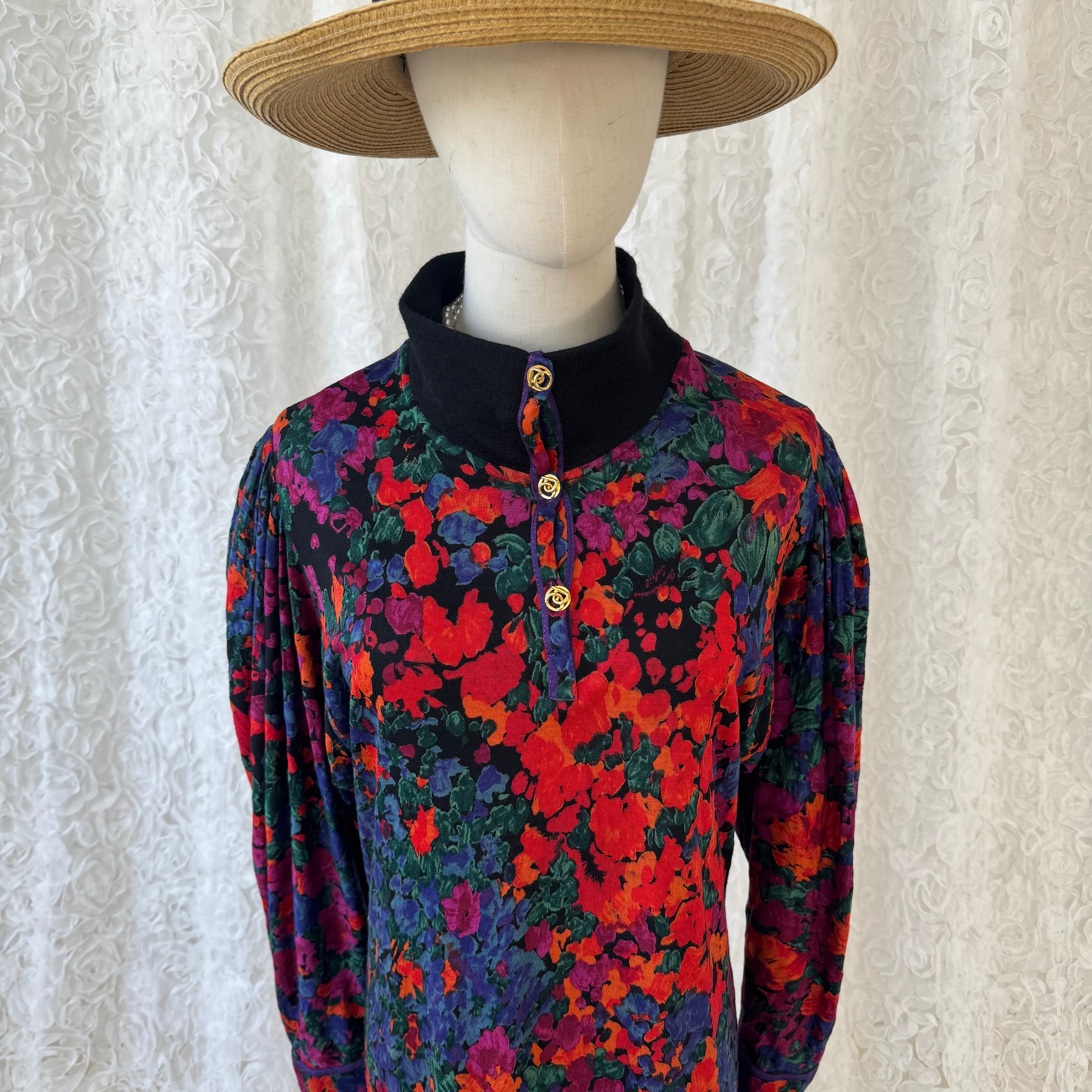 PRINCE CARMINO PARIS ヴィンテージ 花柄ワンピース 長袖 ミディ丈 ポロカラー 2WAY襟 総柄 フレンチレトロ 上品 華やか 伸縮素材