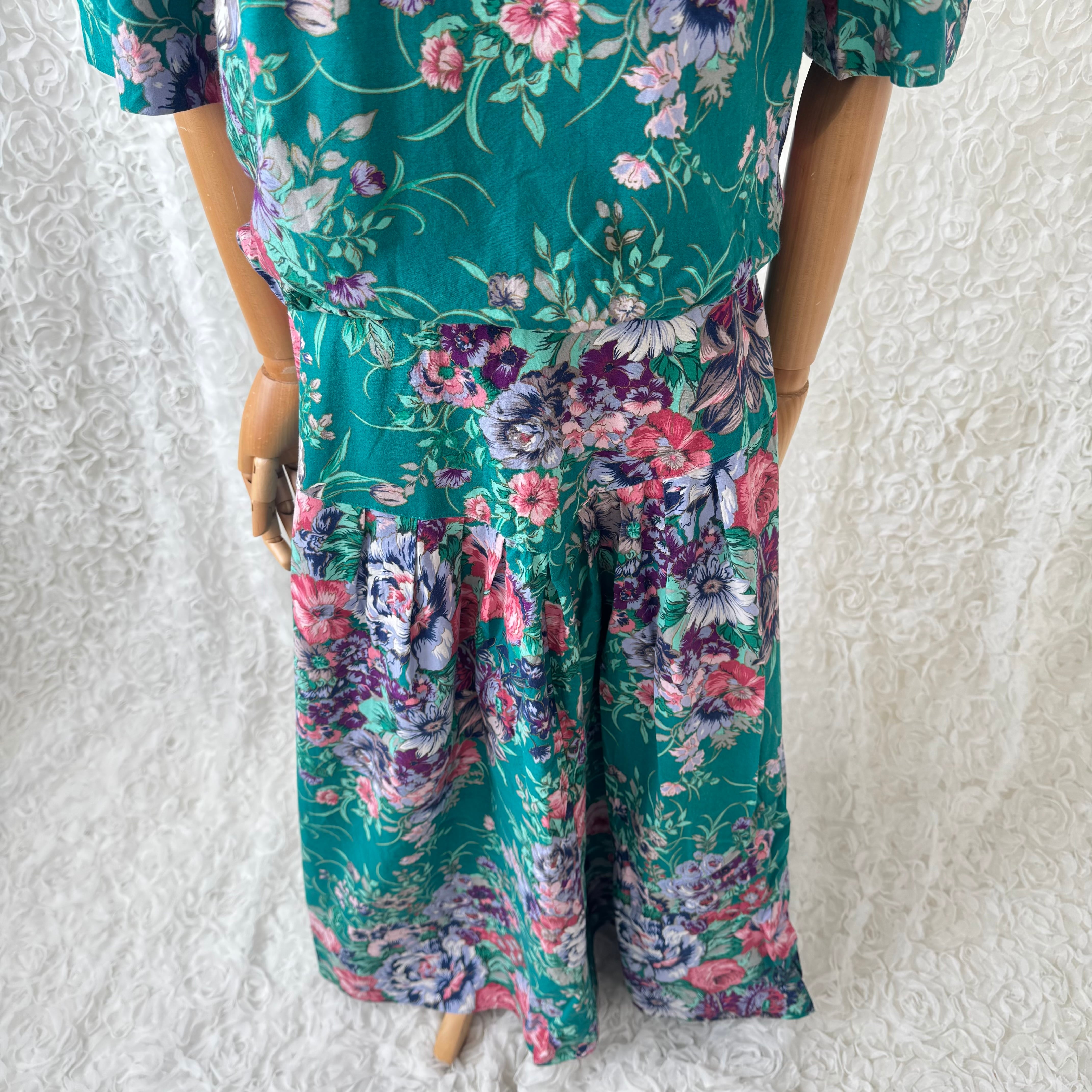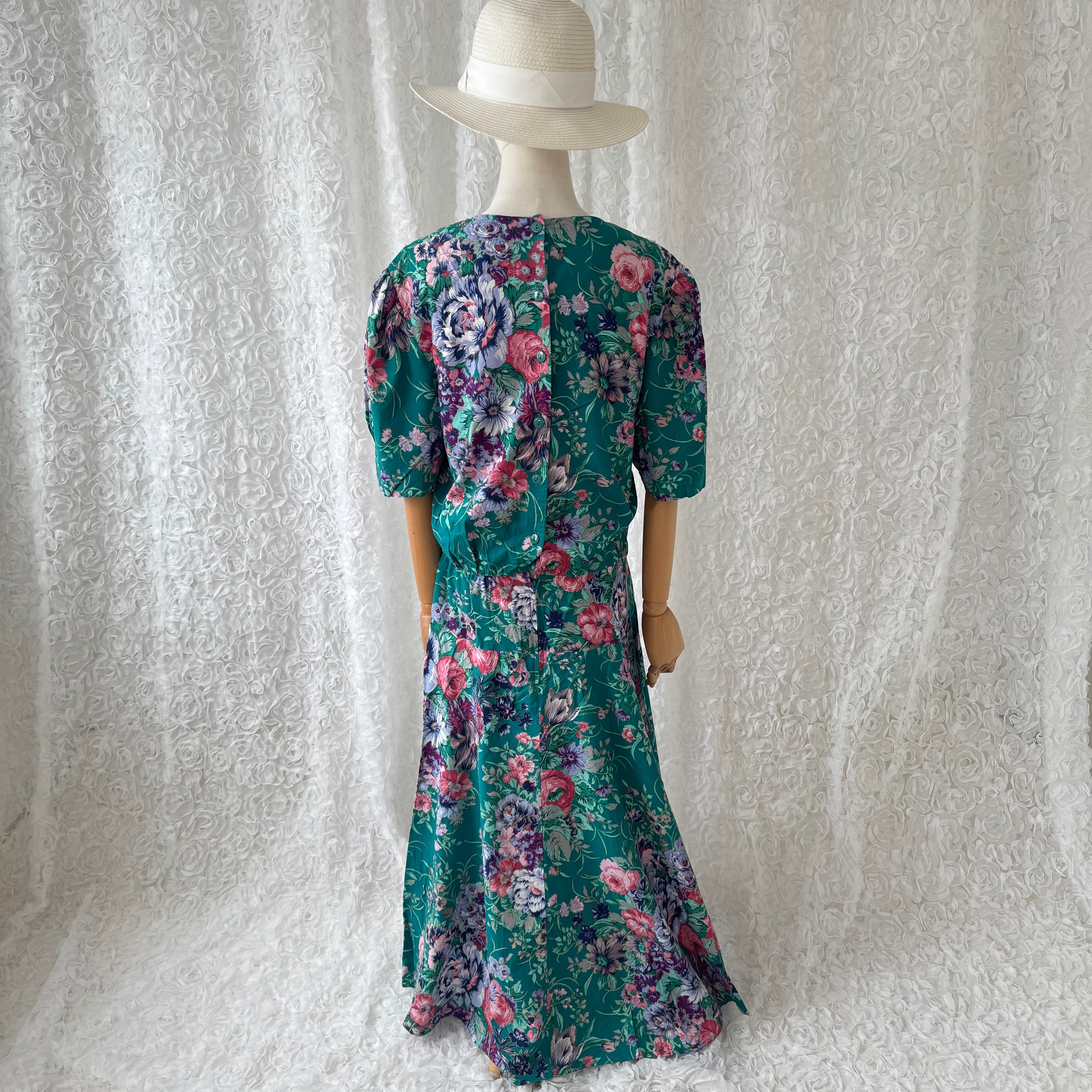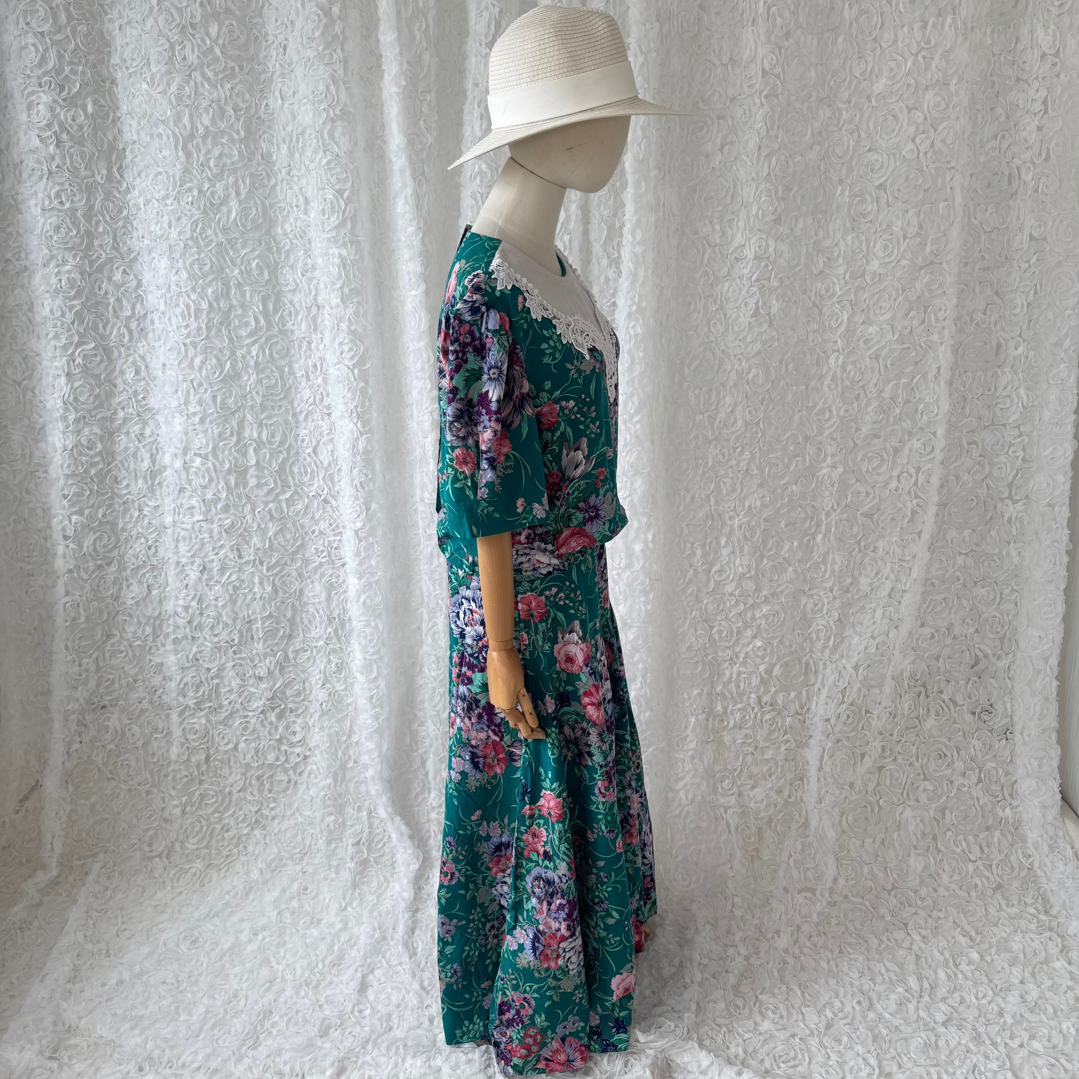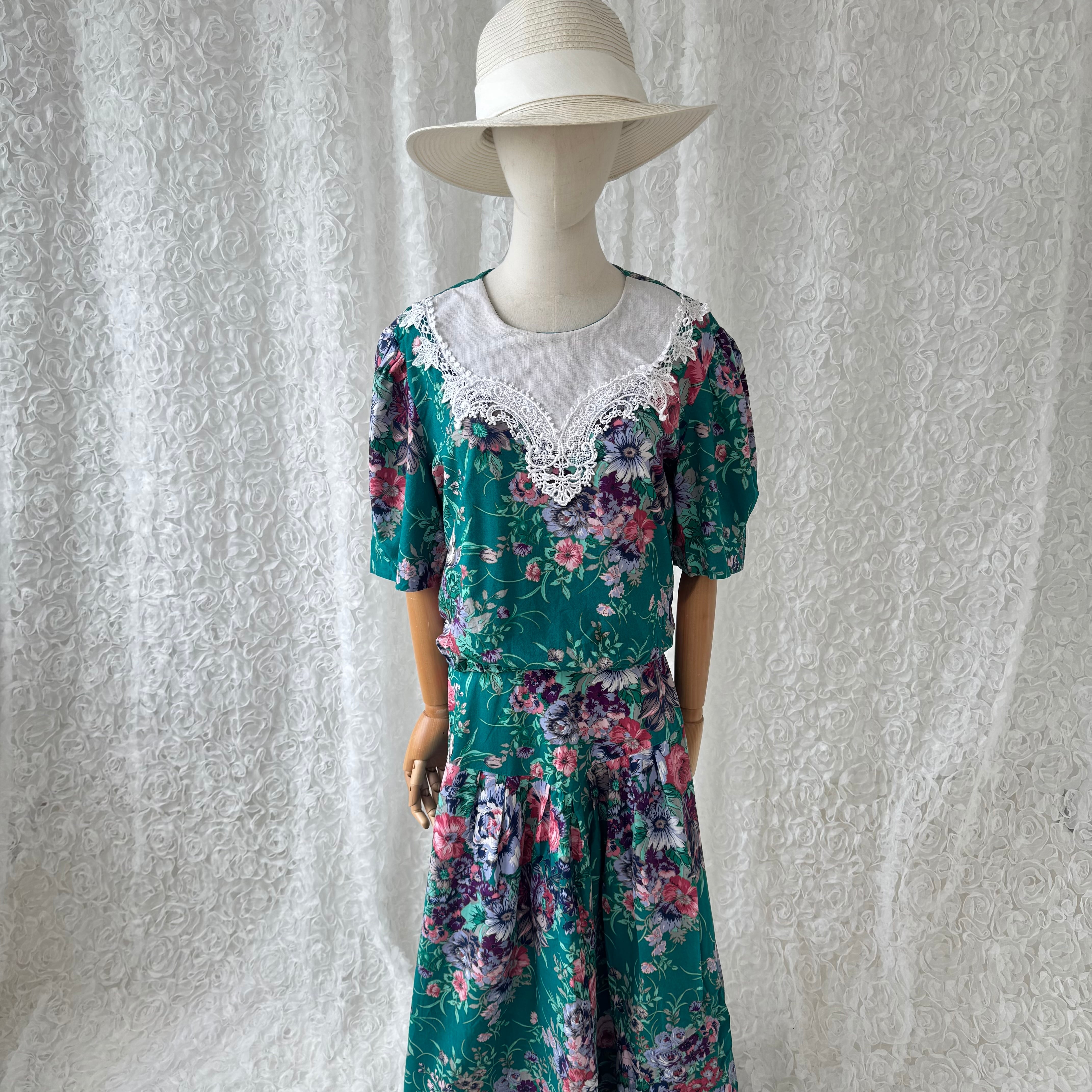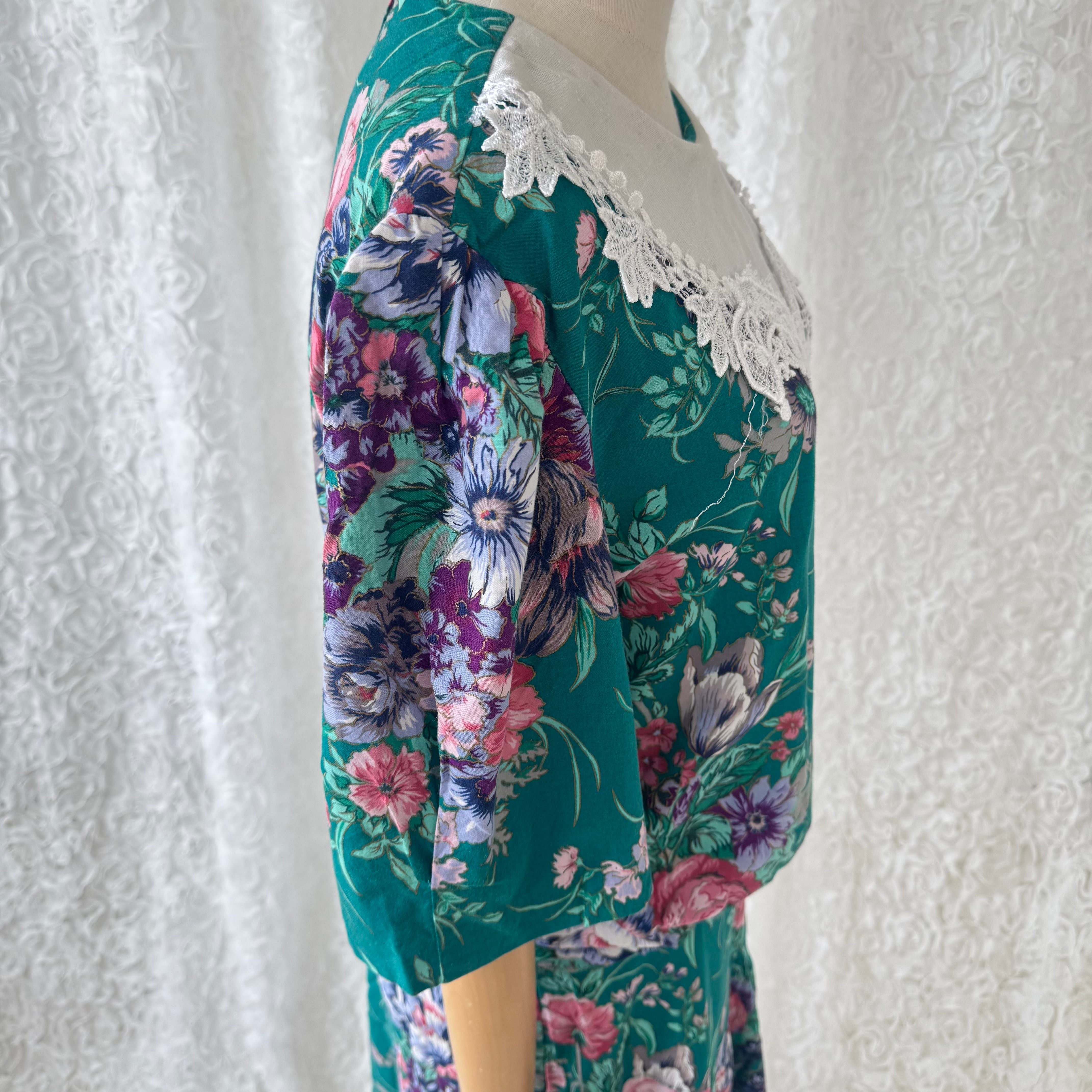 花柄グリーンワンピース USA製 LISA II レース襟 ヴィンテージ ロング丈 フラワープリント 半袖 クラシカルデザイン 上品レトロスタイル