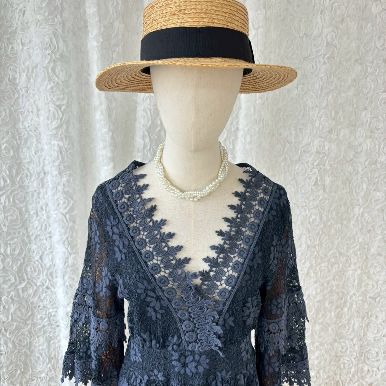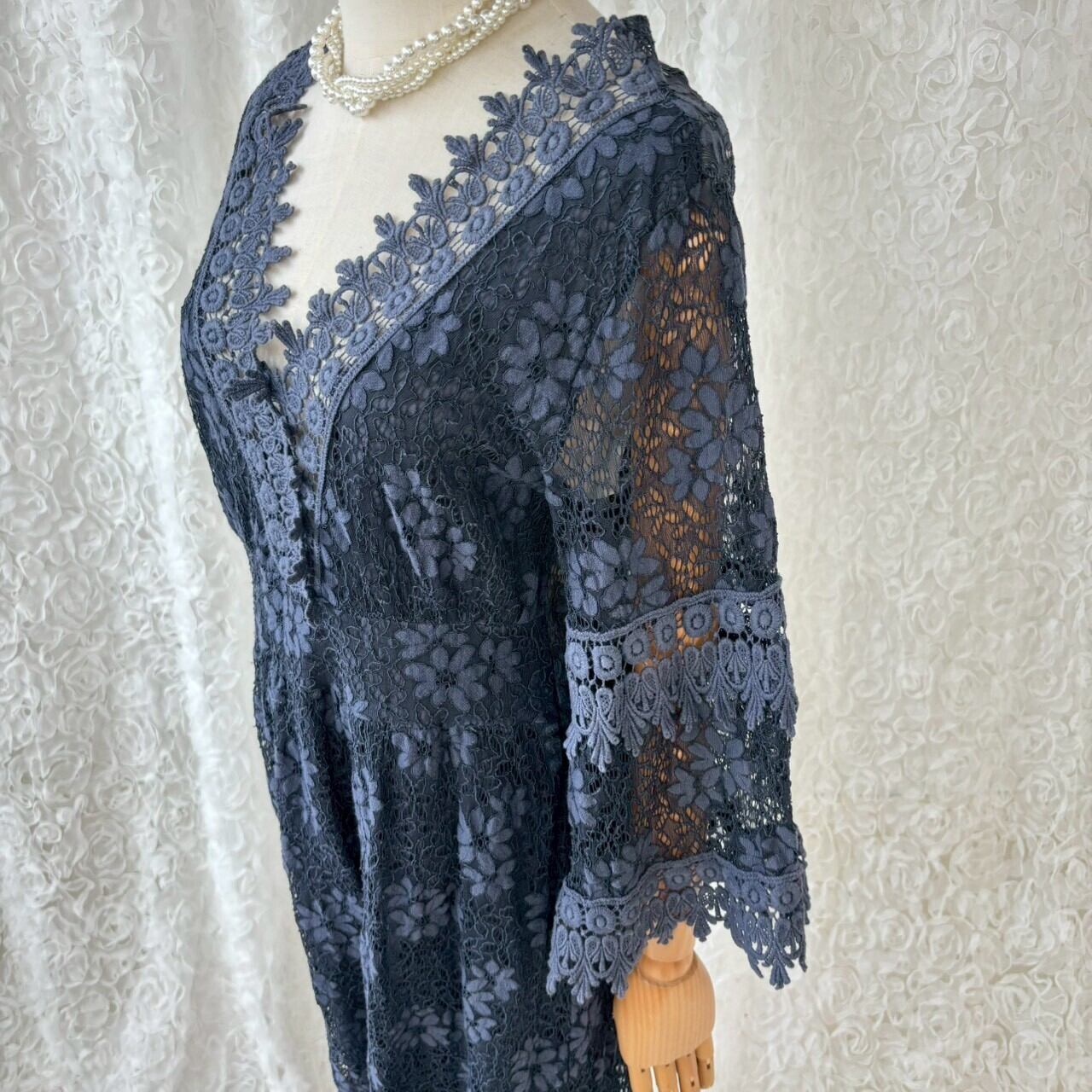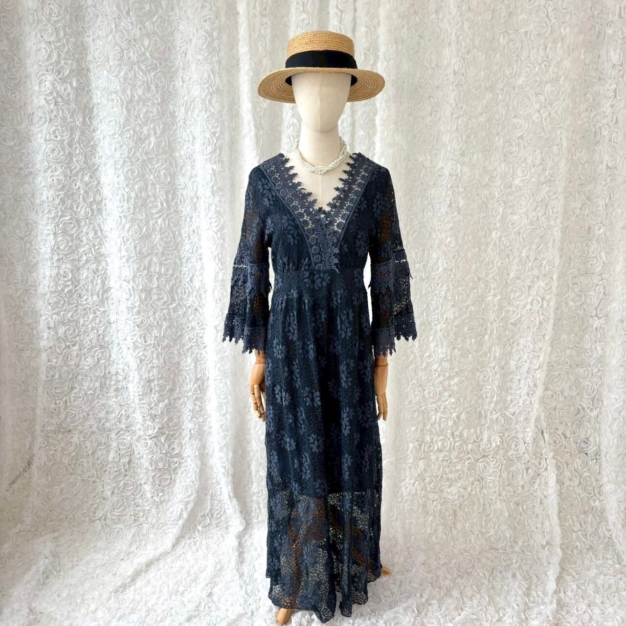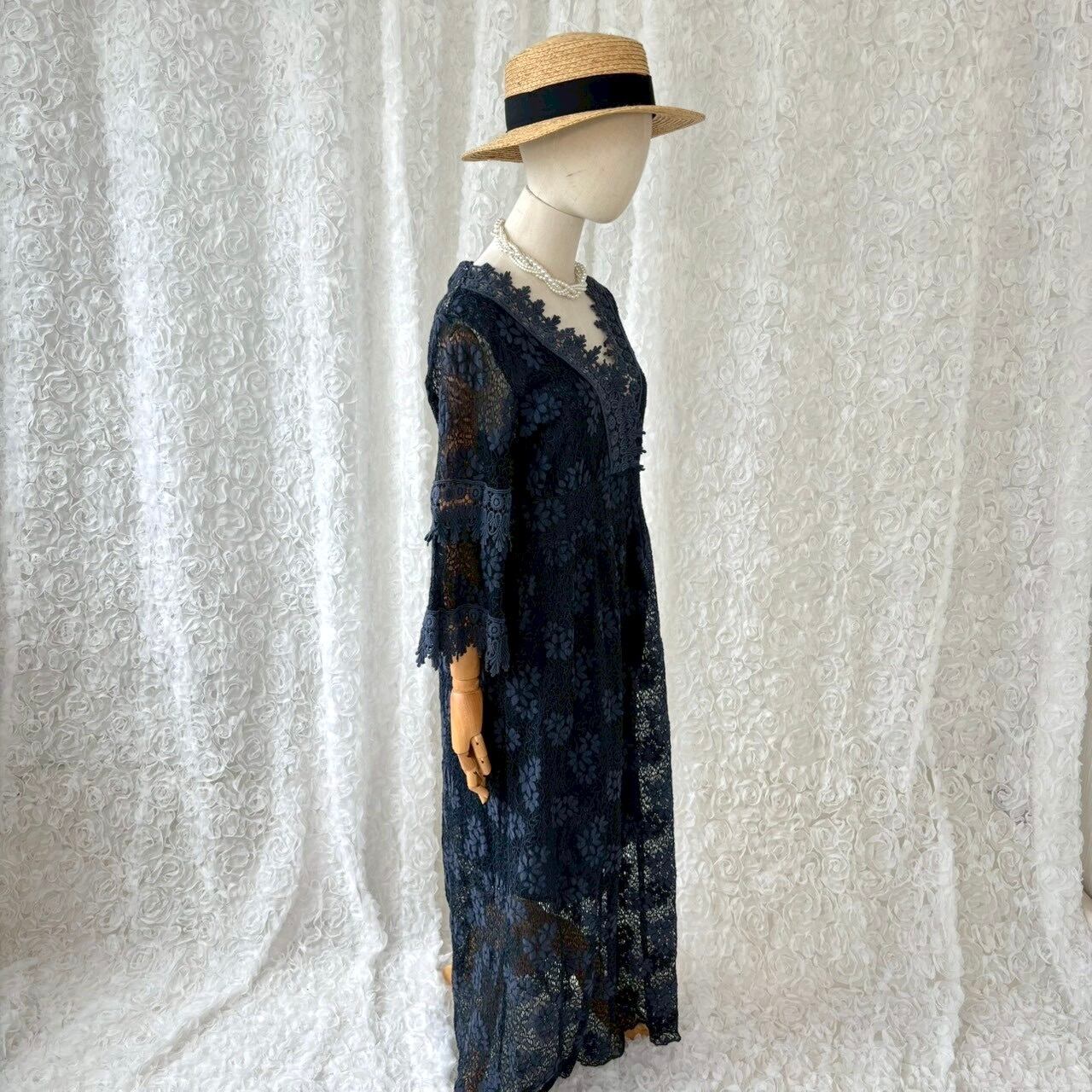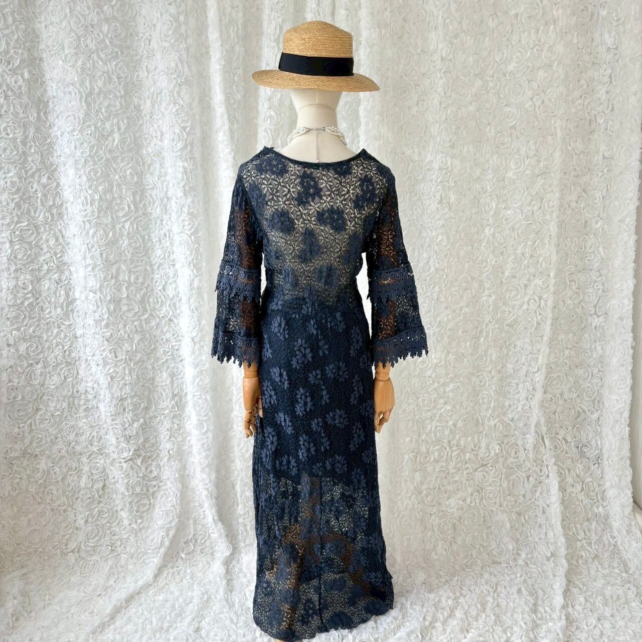 イタリア製 花柄レースワンピース ロング丈 透け感 ネイビー フレア袖 ヴィンテージ ドレス 上品 大人 フェミニン