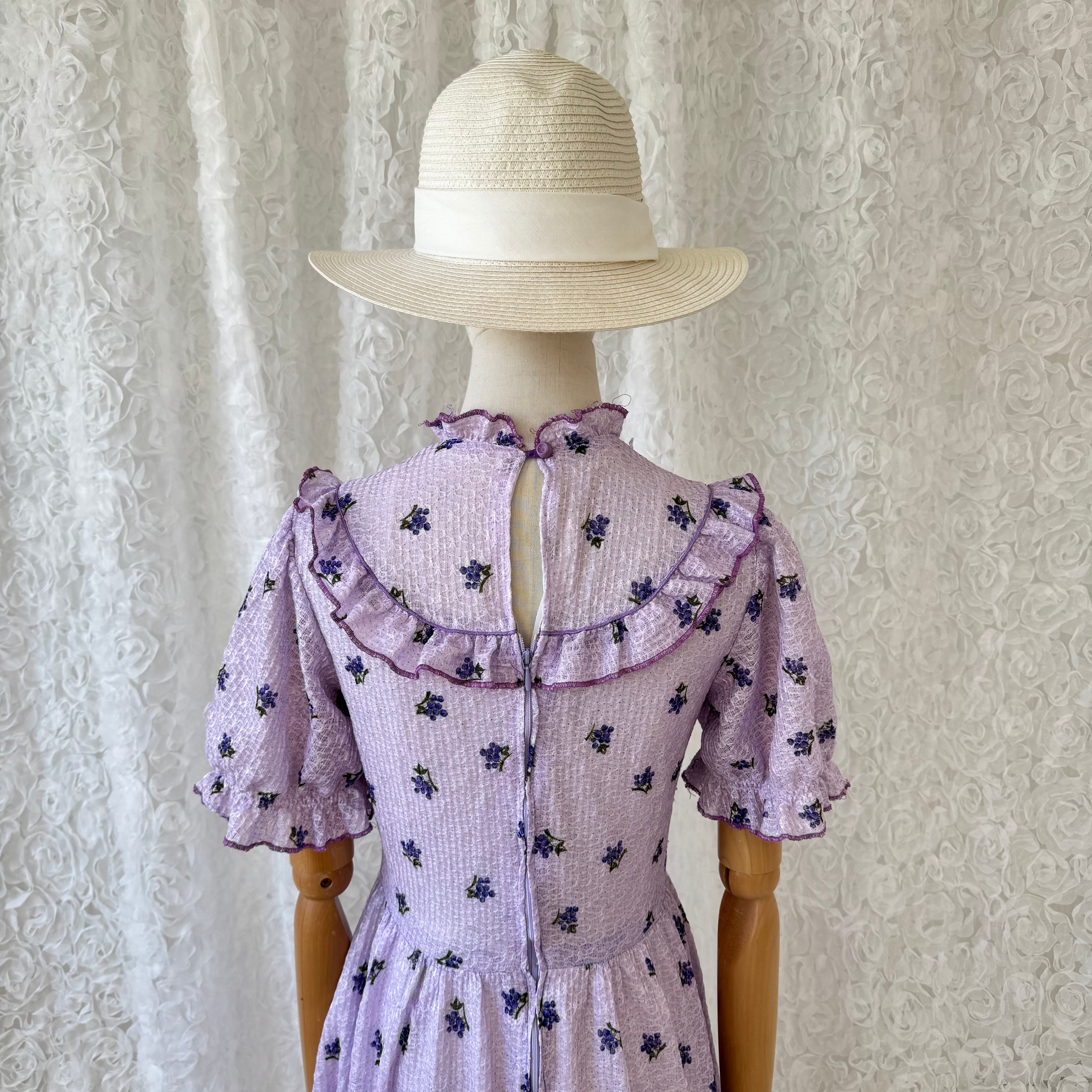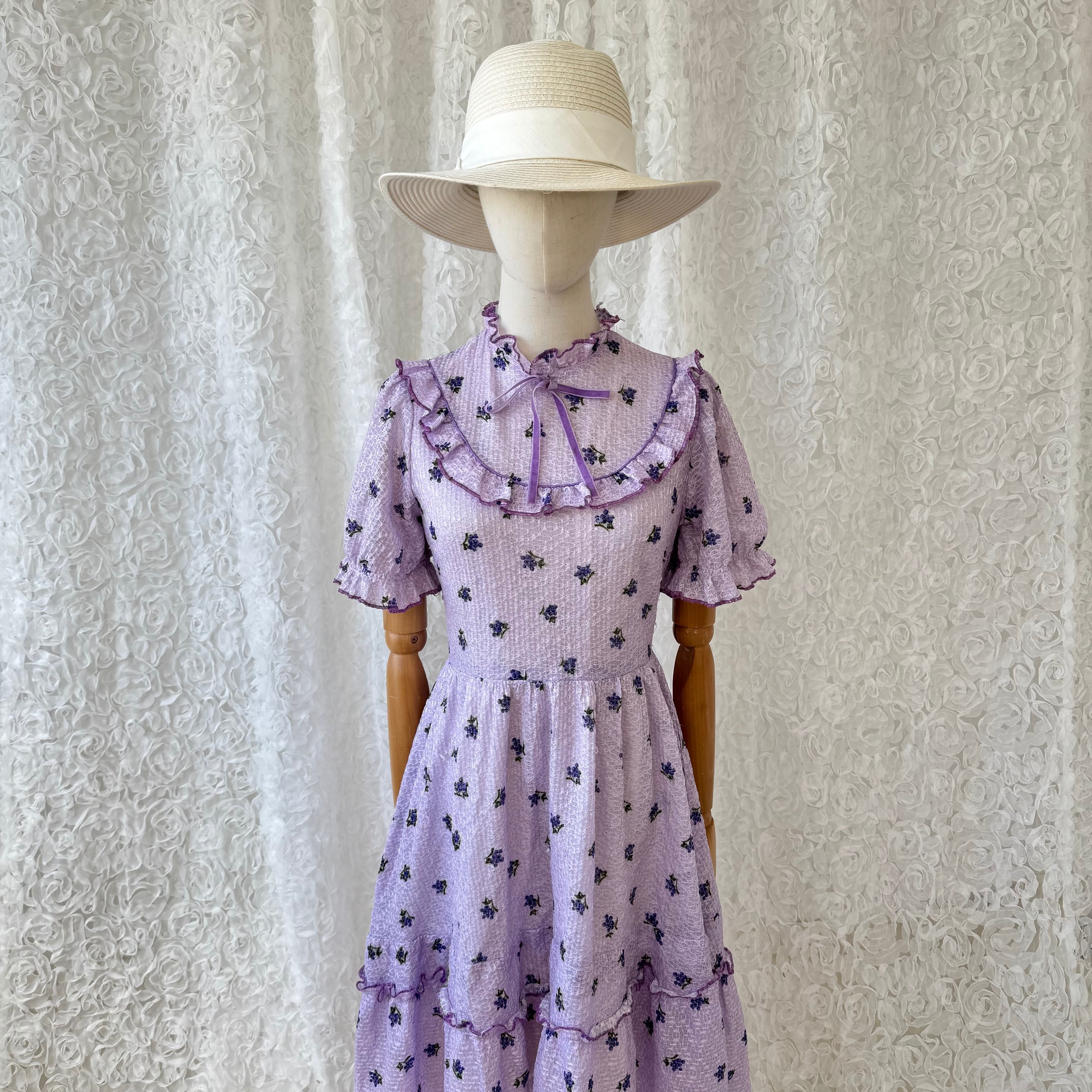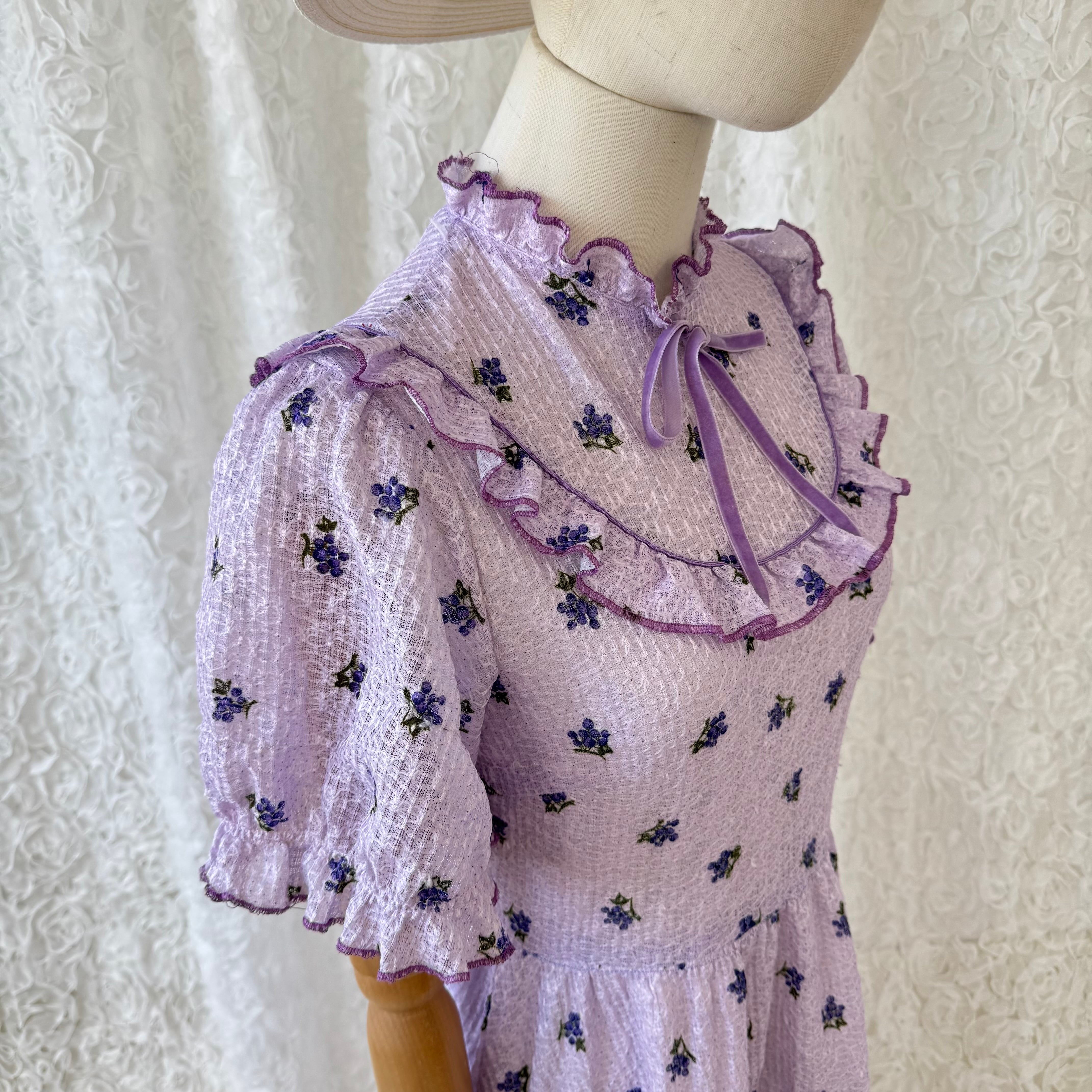 ヴィンテージ ラベンダーカラー 小花柄ワンピース フリルカラー リボン付き パフスリーブ レトロフェミニン ガーリー