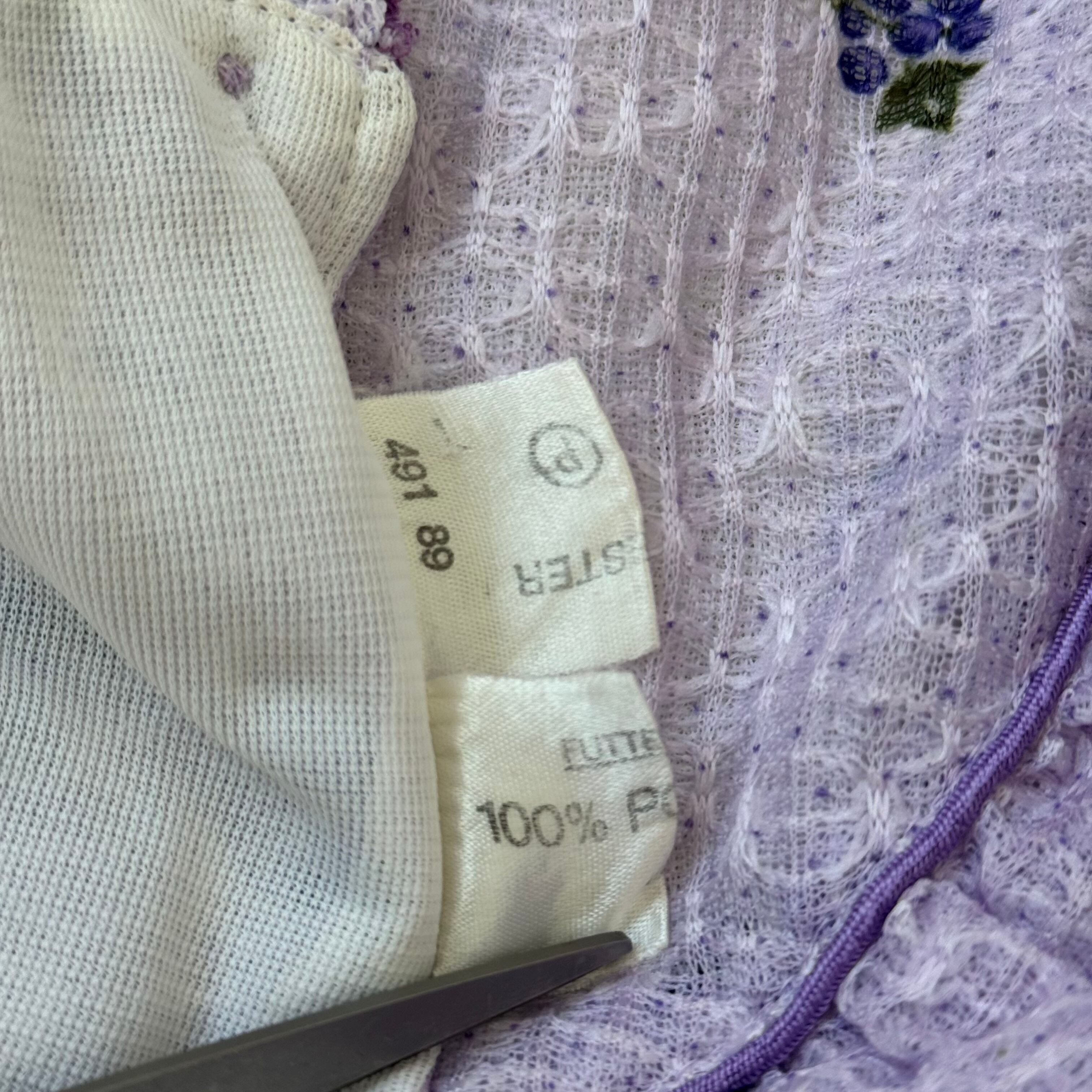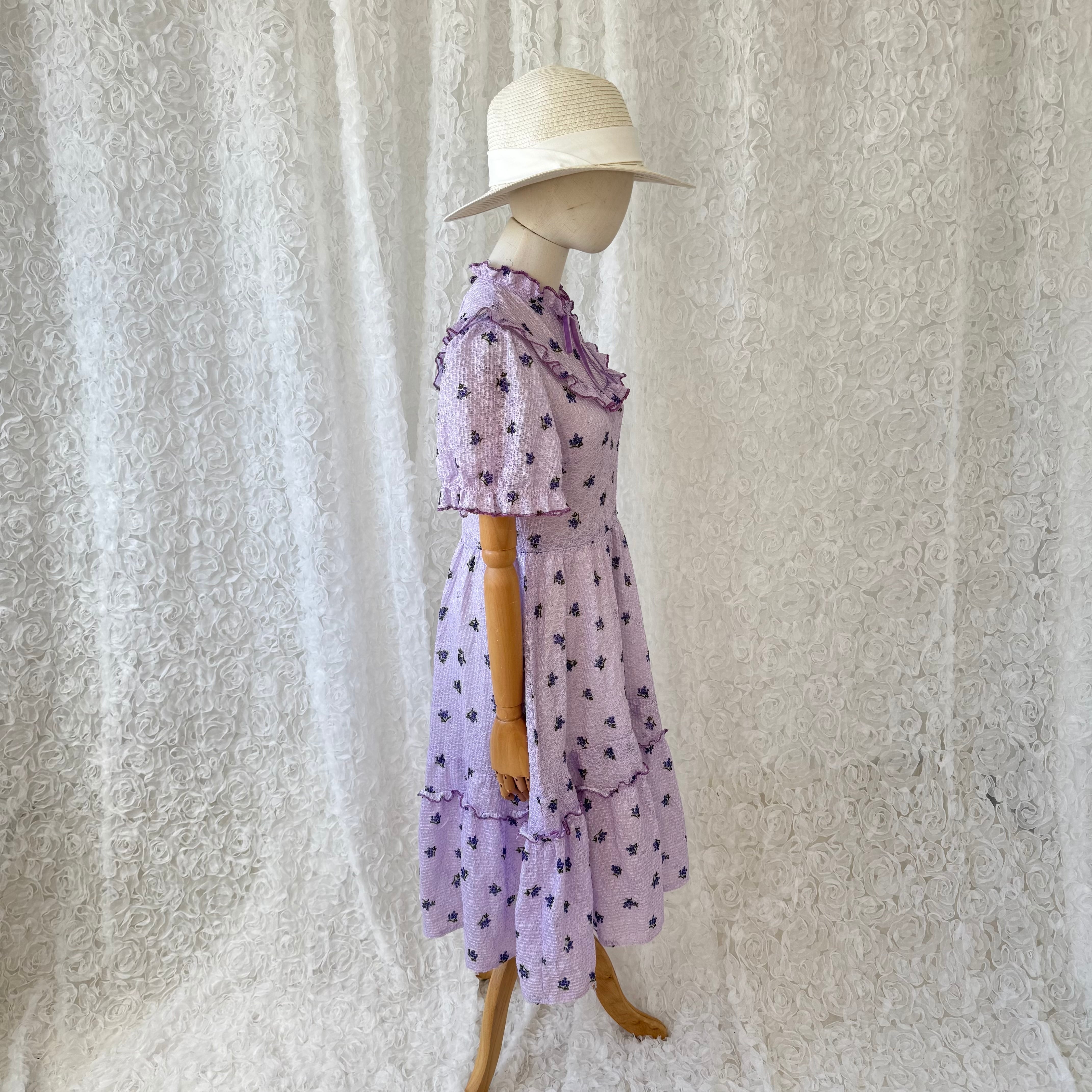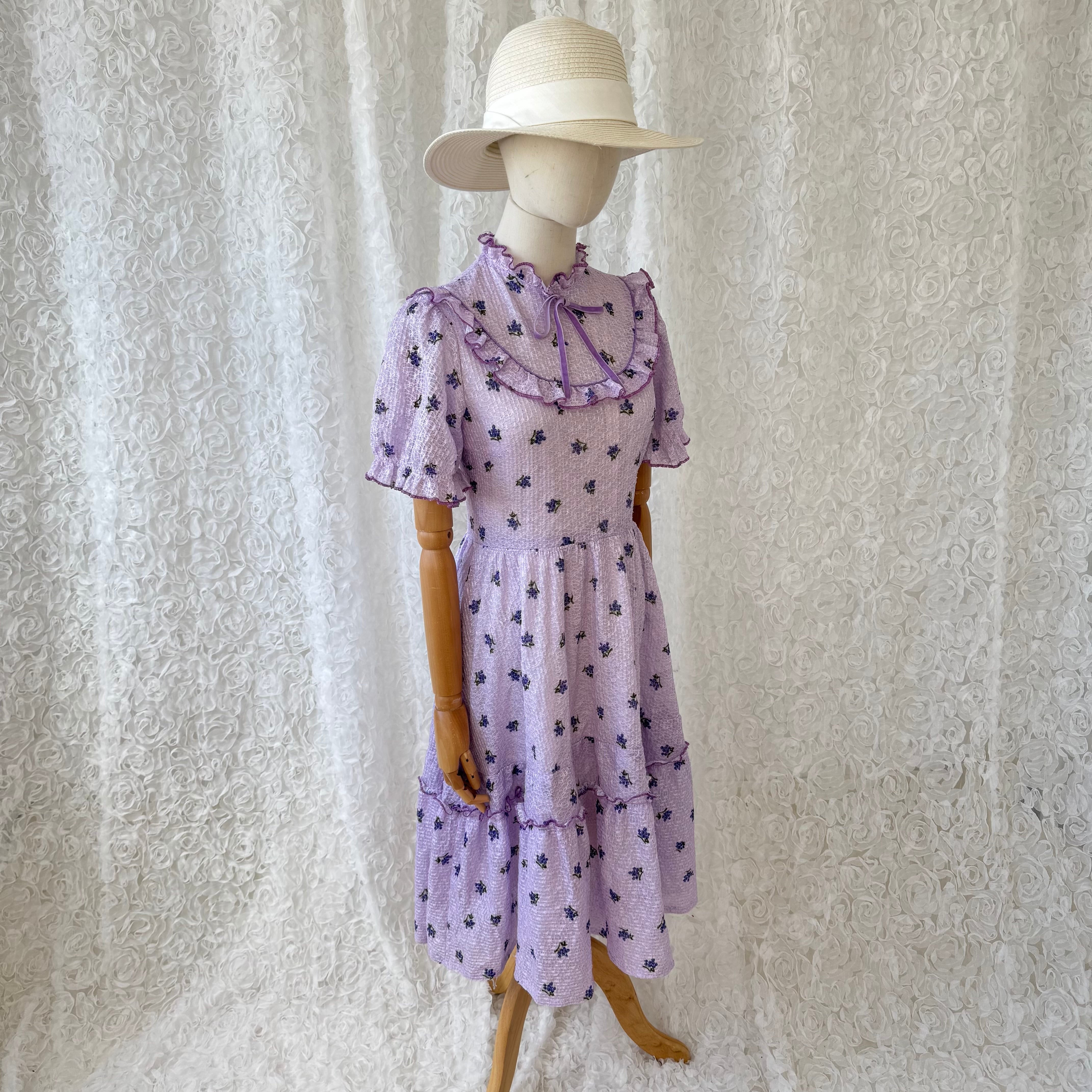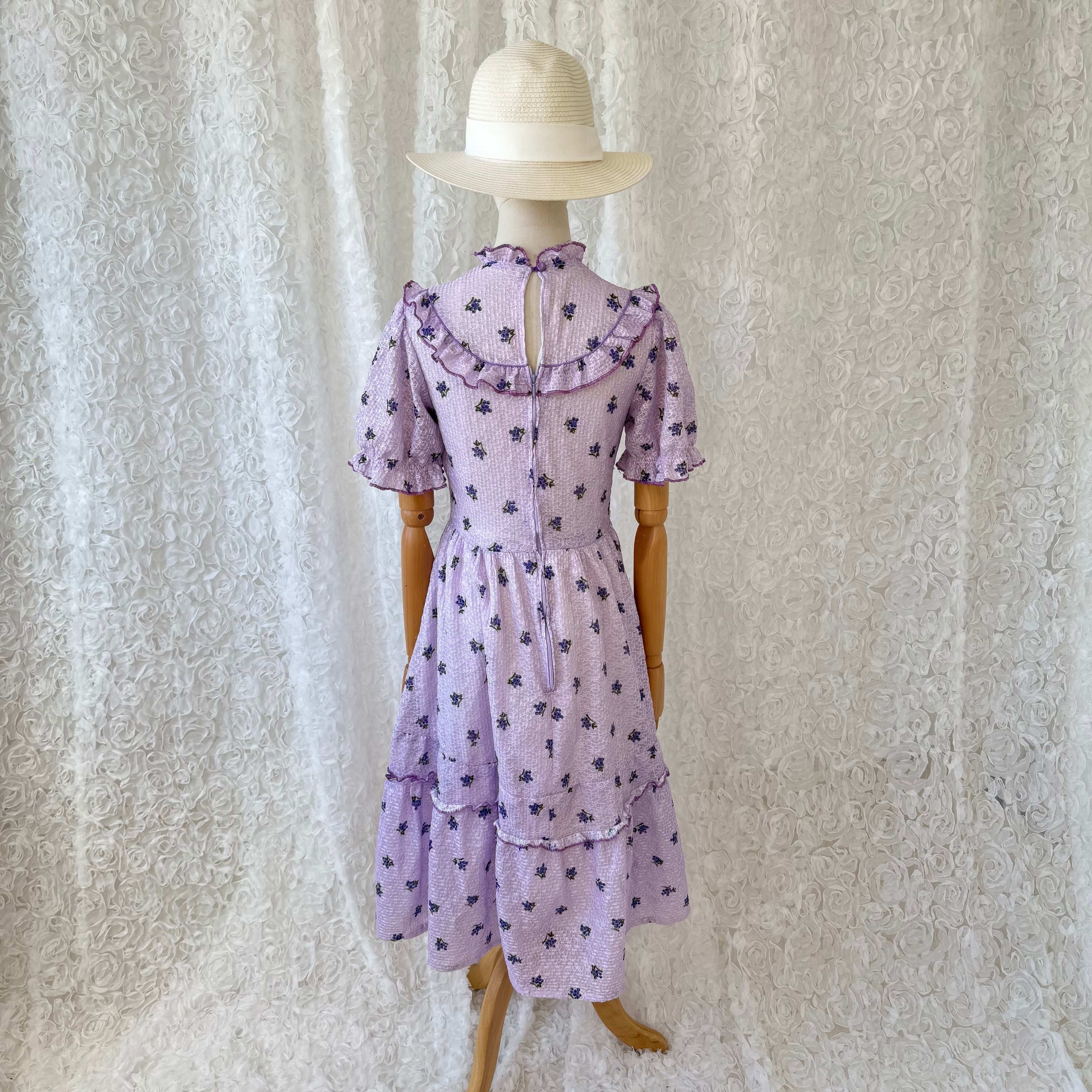 ヴィンテージ ラベンダーカラー 小花柄ワンピース フリルカラー リボン付き パフスリーブ レトロフェミニン ガーリー