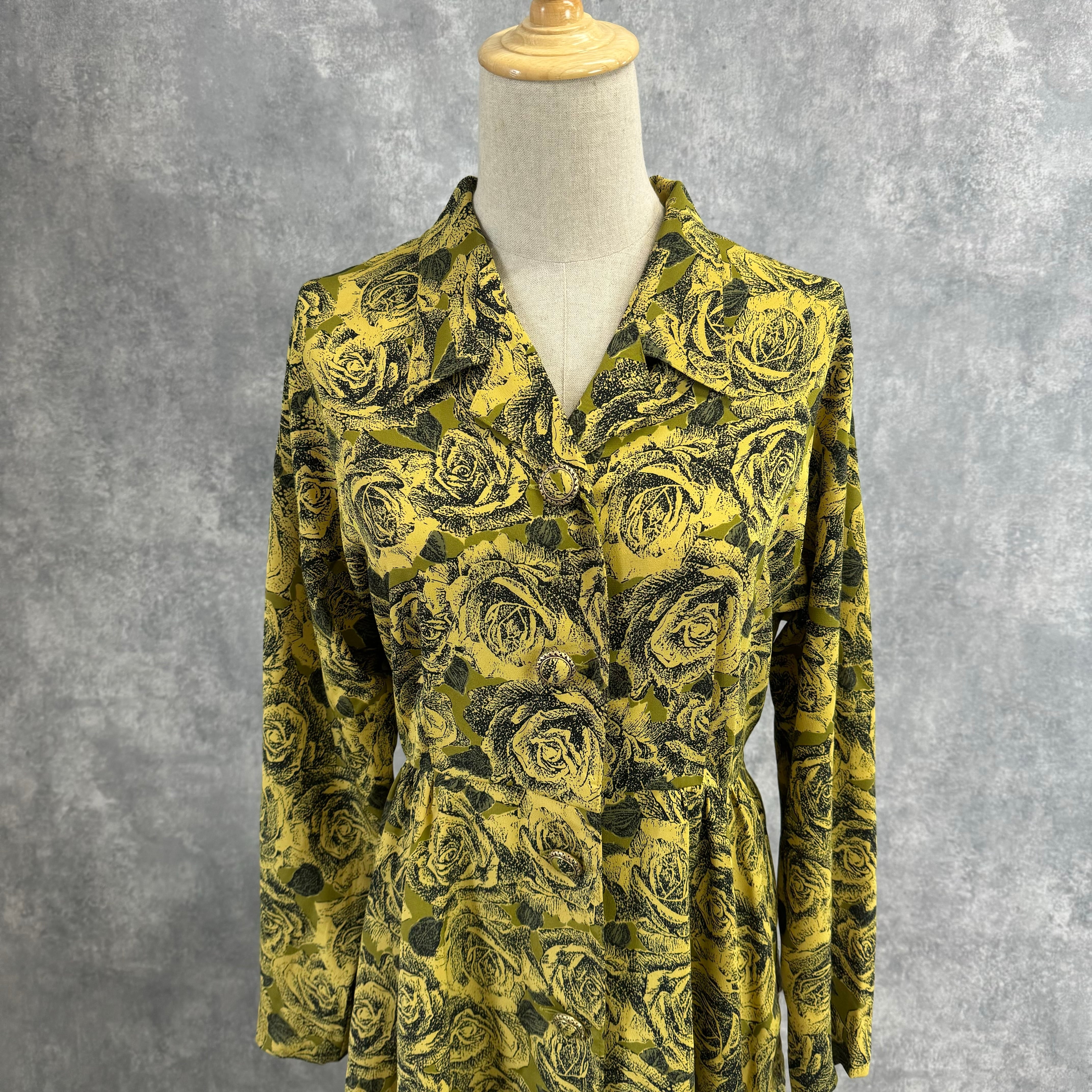 Japanese vintage イエロー×ブラック ローズ柄ワンピース 大人クラシカルなヴィンテージ長袖ワンピース|前ボタンデザイン&ウエスト切替|レトロエレガントスタイル | mone_vintage