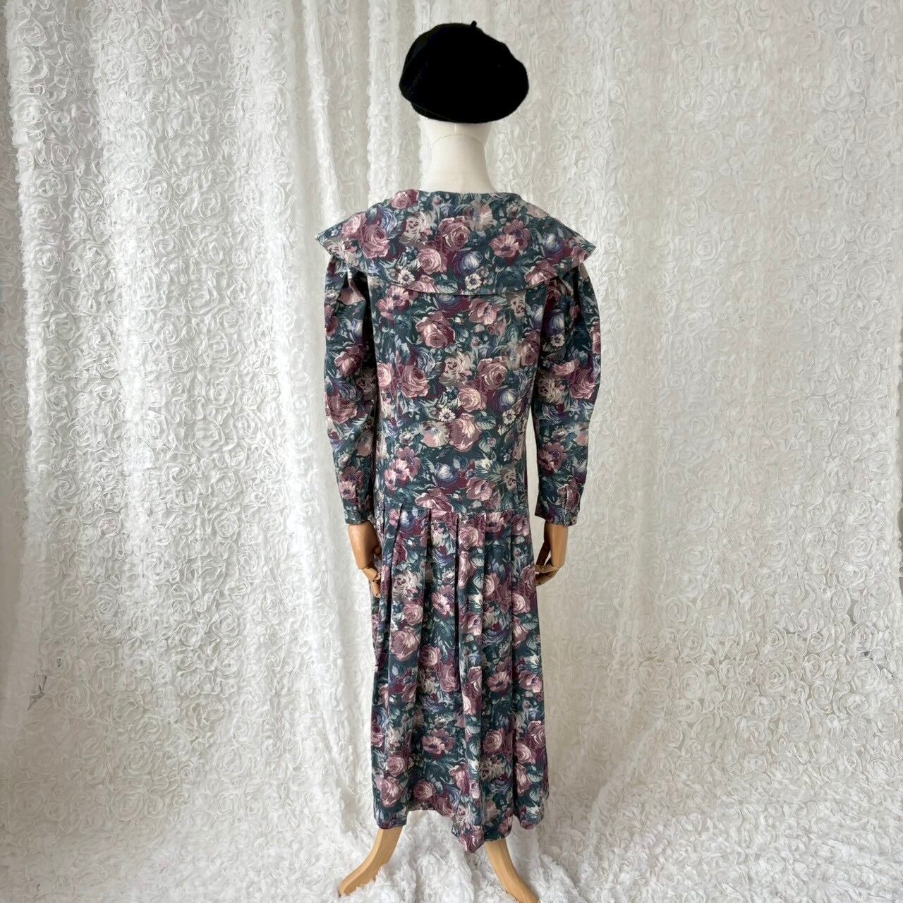 Laura Ashley ローラアシュレイ 花柄 セーラー襟コーデュロイワンピース UK14 ヴィンテージ ロング丈