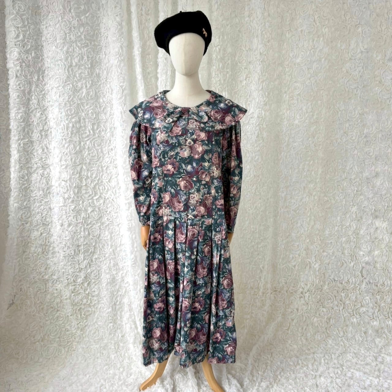 深みグリーンにローズ柄が映える一着。