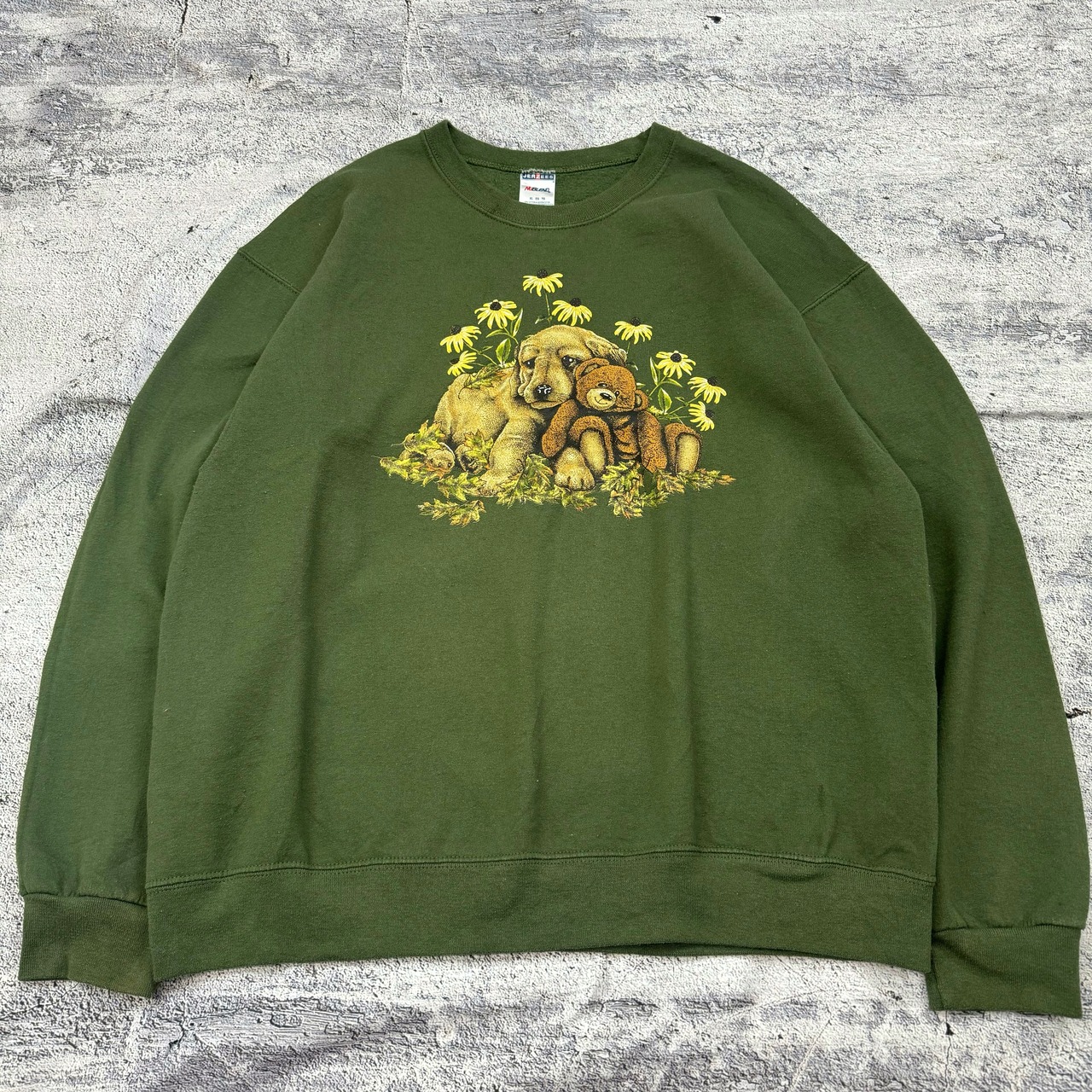 ゴールデンレトリーバーの子犬とテディベアの可愛らしいアニマル柄が特徴のレトロトレーナーです。