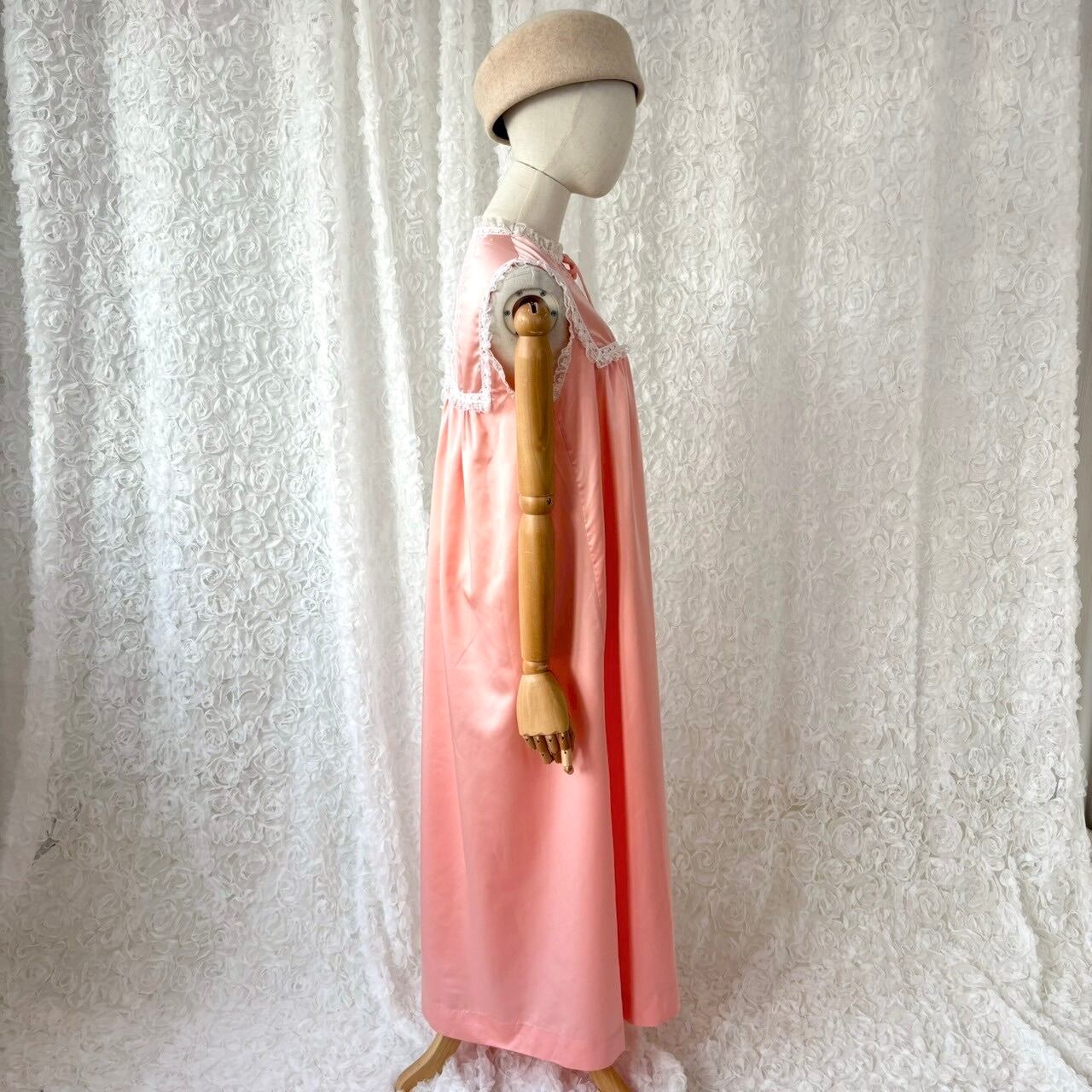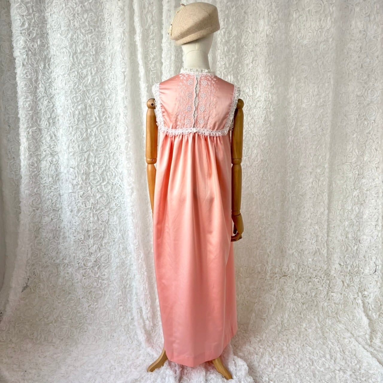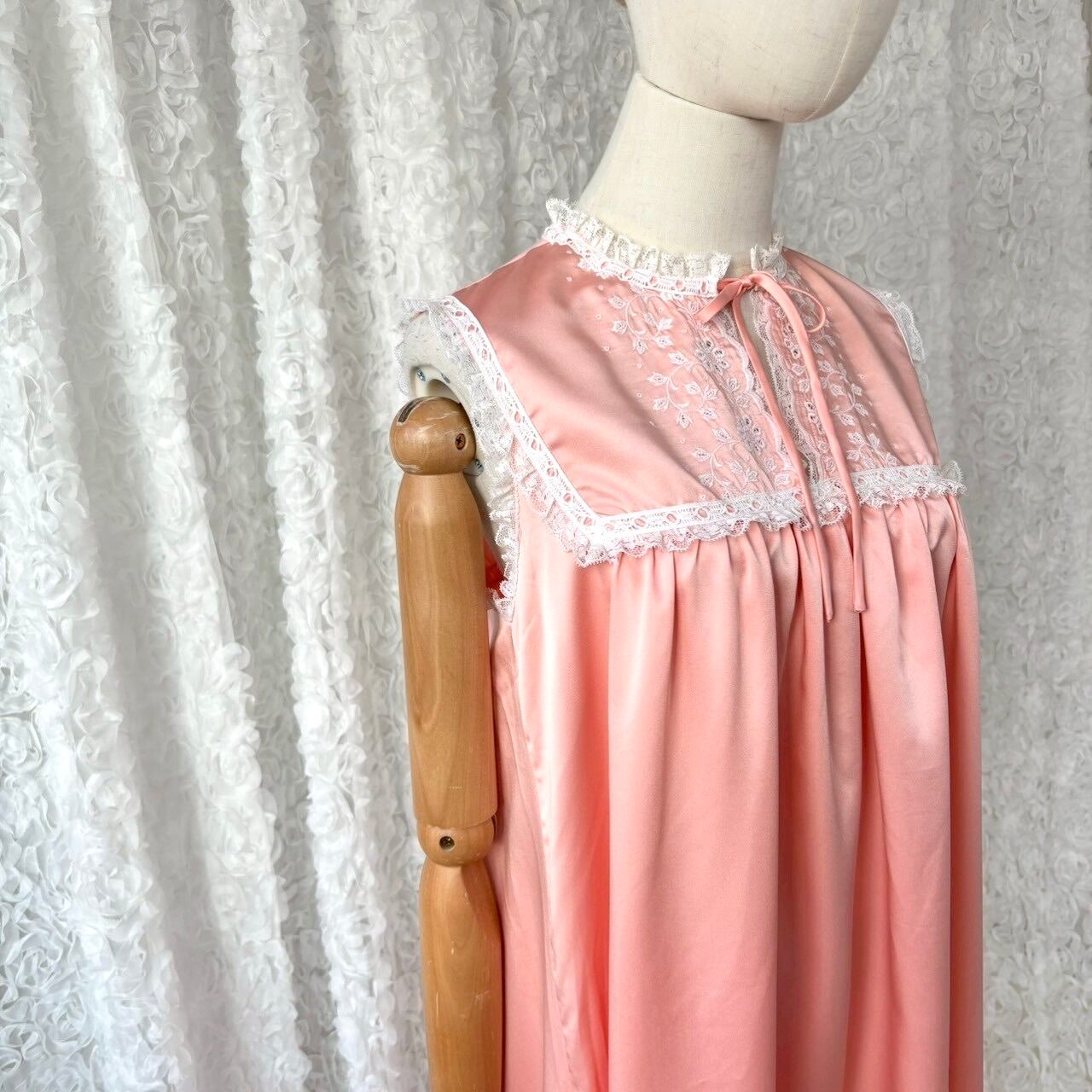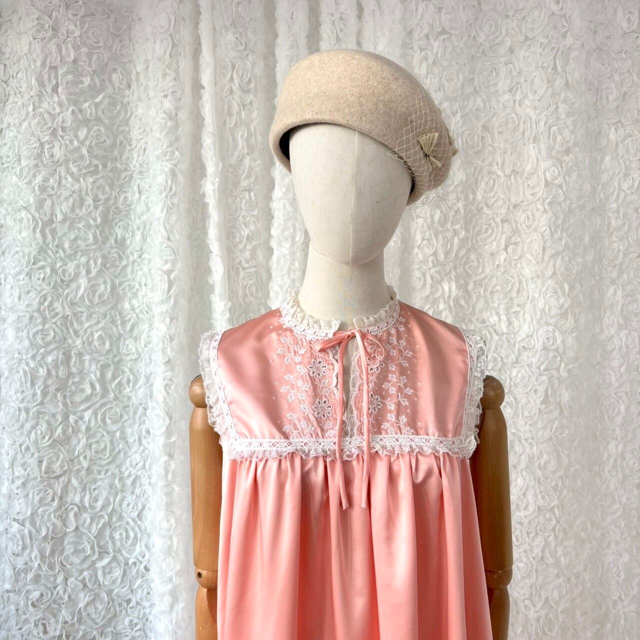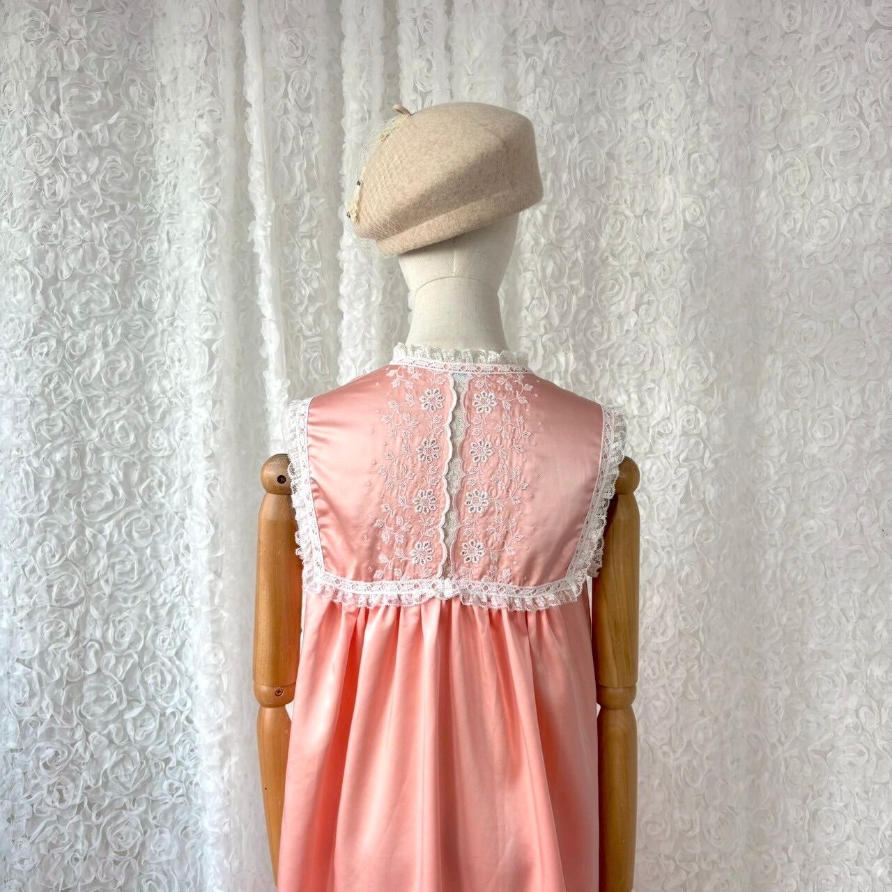 70s USA製 Evo Edelman レースヨーク ピーチピンク ロングワンピース 刺繍 ナイトドレス ヴィンテージ