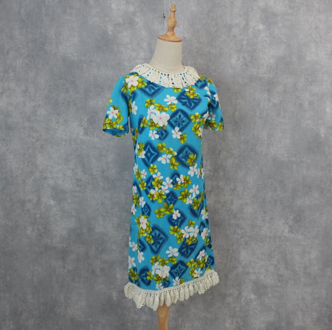 特徴的なかぎ針編み装飾が裾と襟に施されており、全体に繊細でフェミニンな印象をプラスしています。