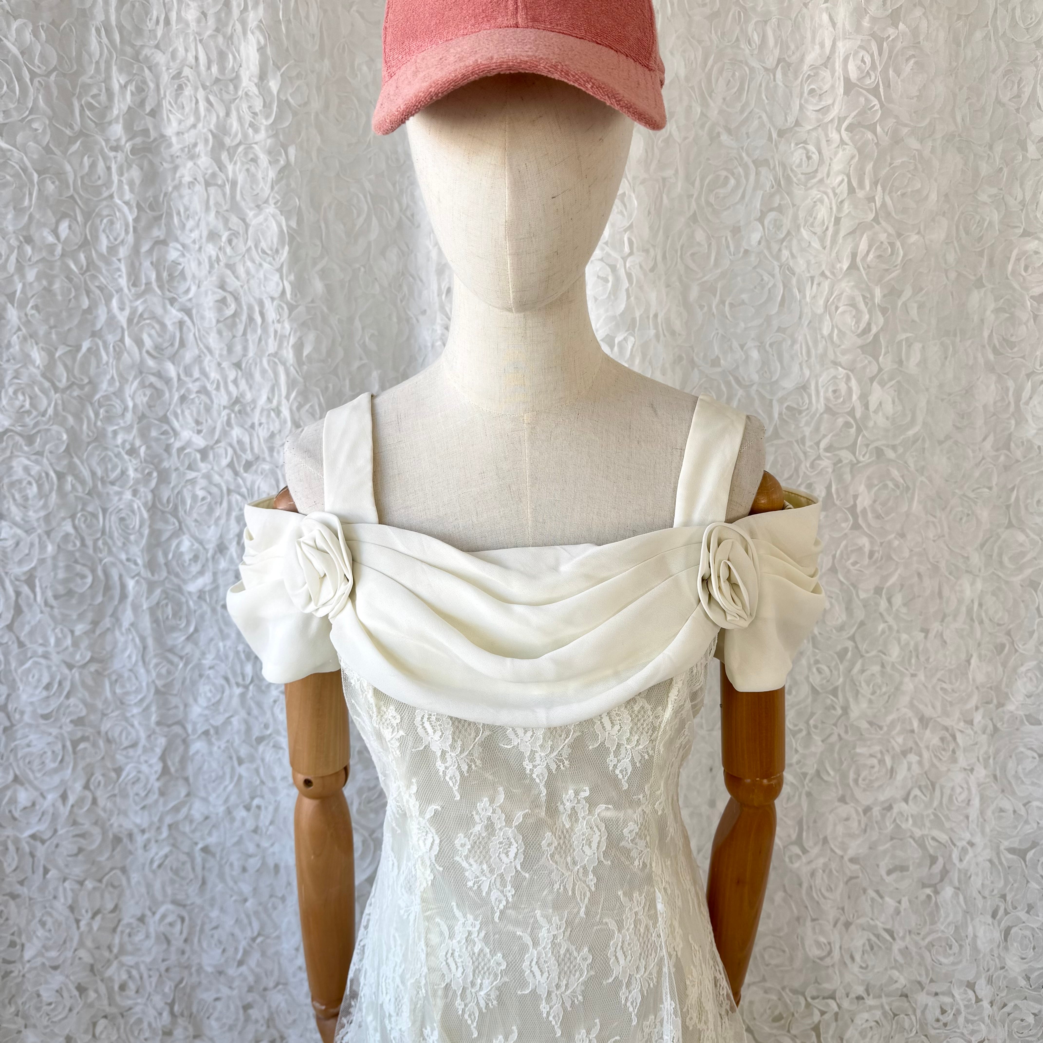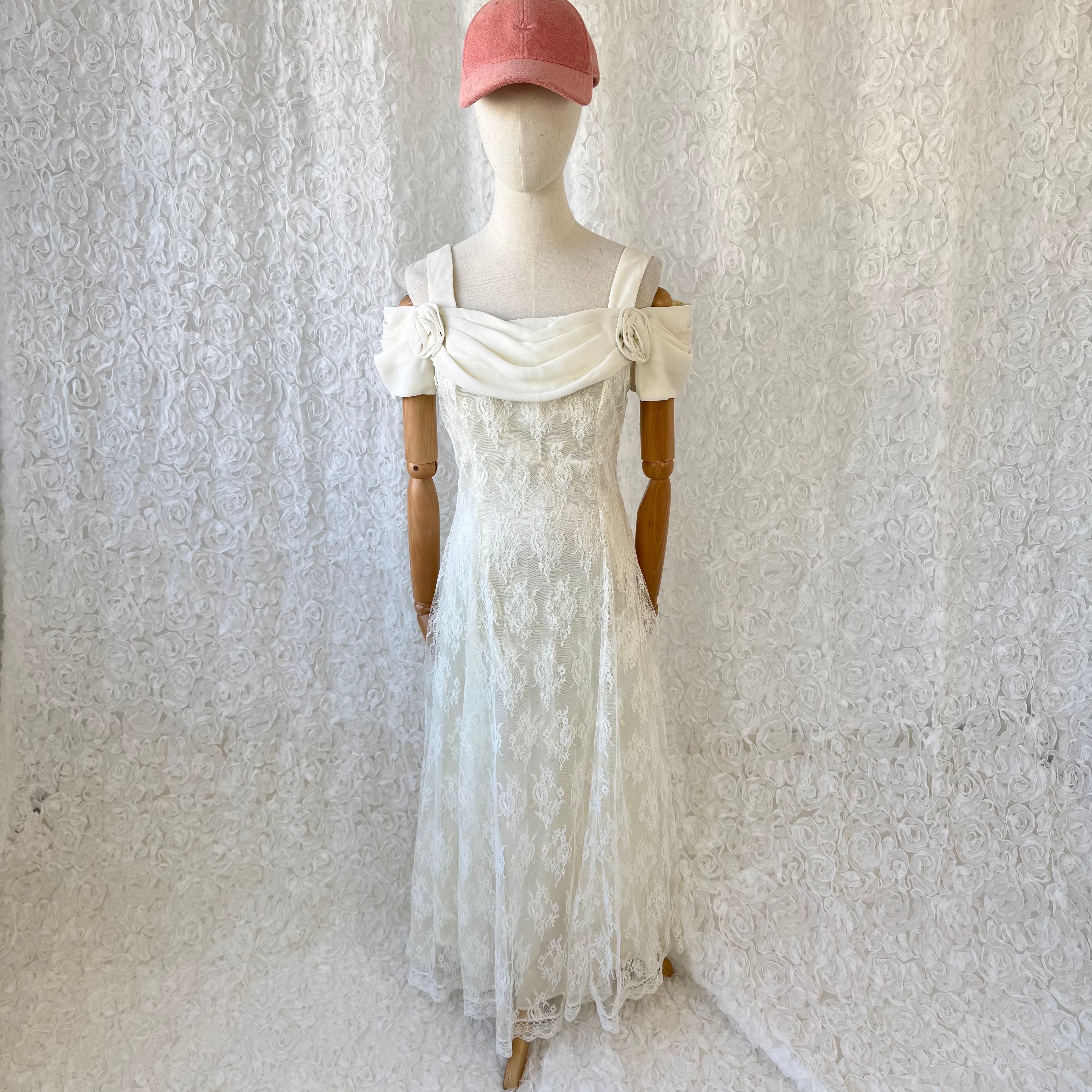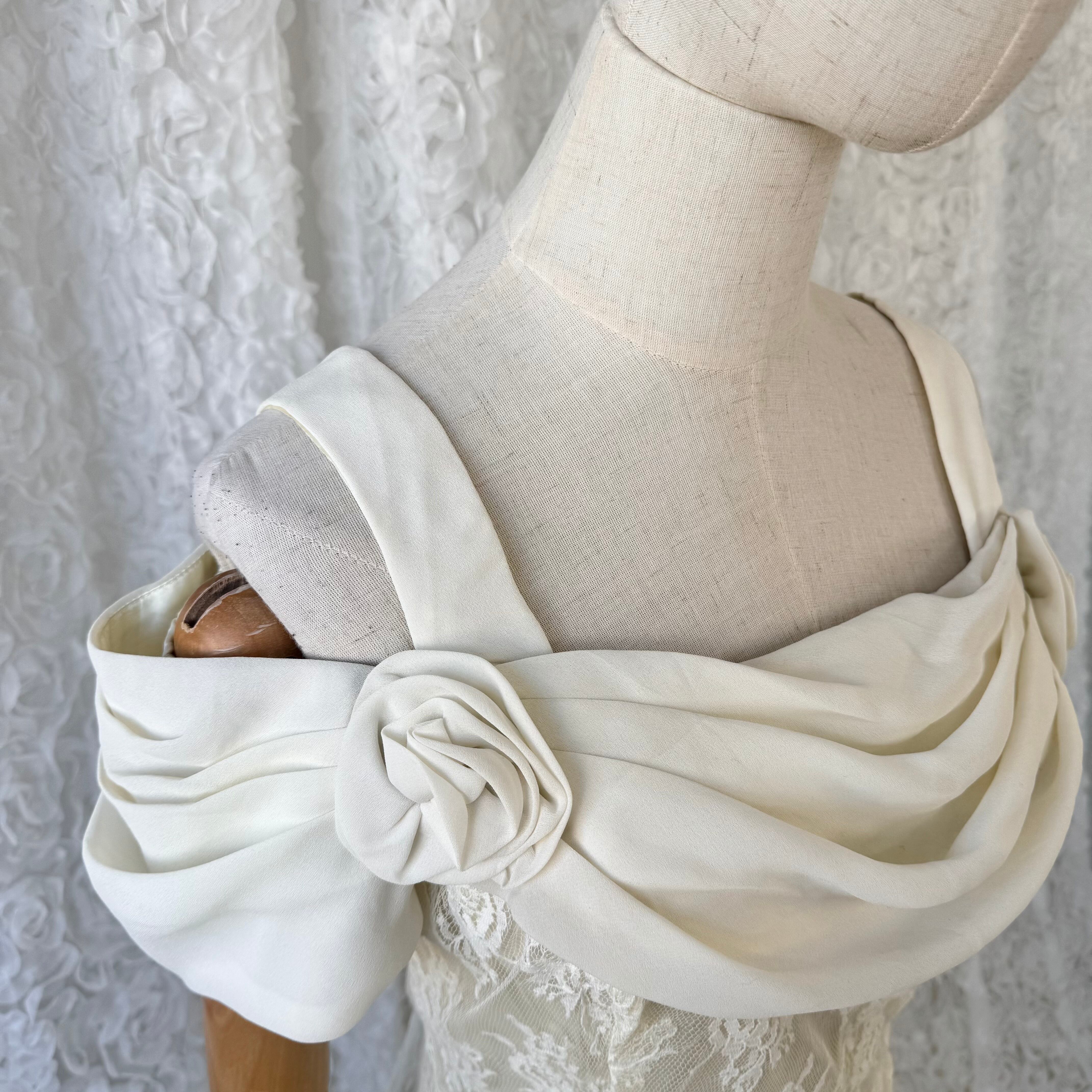 繊細なレースに、肩まわりのドレープとローズモチーフが映える、Scott McClintockのエレガントなロングドレス。